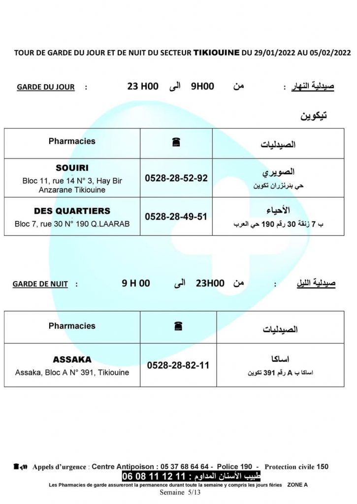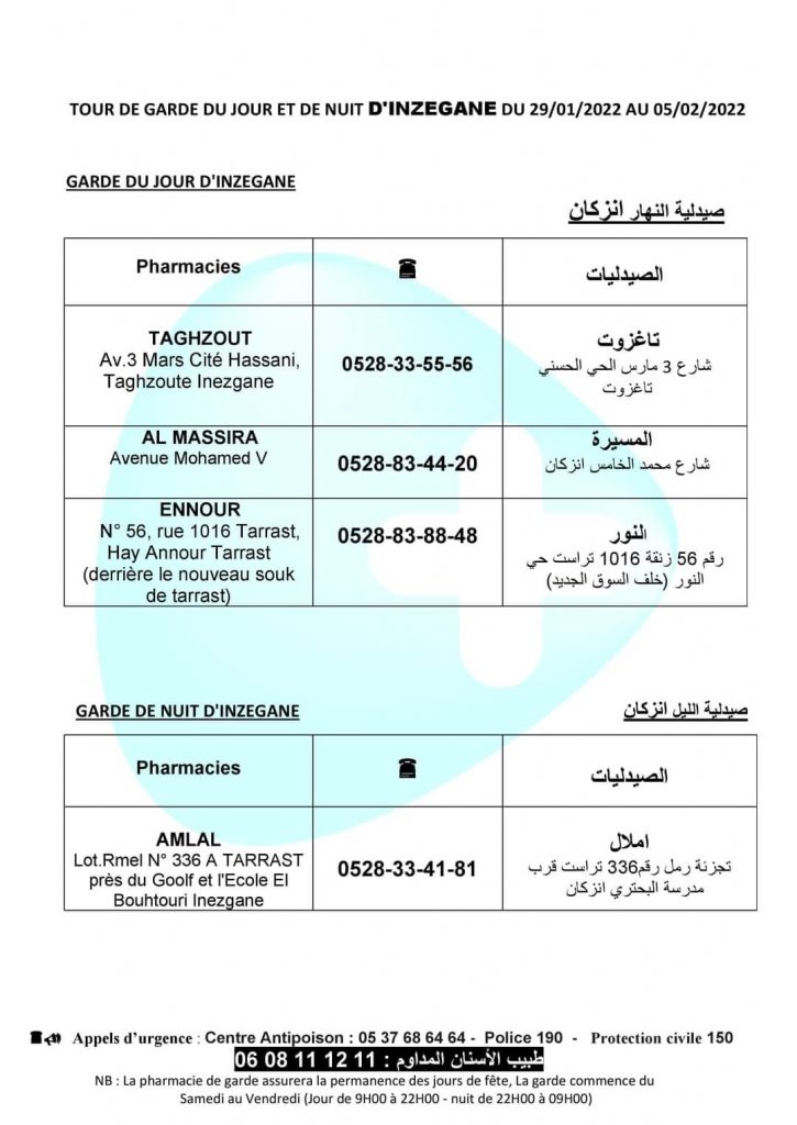 هذه صيدليات الحراسة من السبت29 يناير 2022 الى السبت05 فبراير 2022 باكادير و انزكان والتي تؤمن الحراسة النهارية او الليلية.