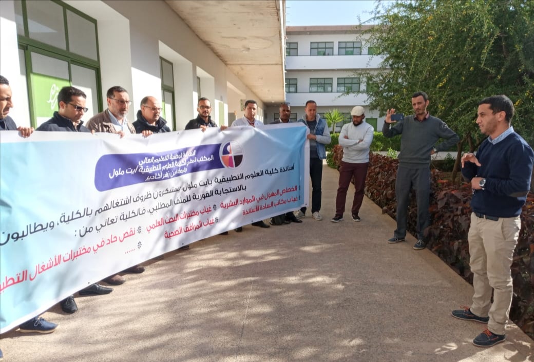 وتبعا لذلك، جدد المكتب المحلي للنقابة الوطنية للتعليم العالي مطالبته “رئاسة جامعة ابن زهر والوزارة الوصية ببناء كلية العلوم التطبيقية بأيت ملول حسب المعايير المعتمدة”، و“سد الخصاص المهول في هيئة الأساتذة الباحثين والأطر الإدارية نظرا لنسبة التأطير المتدنية”.