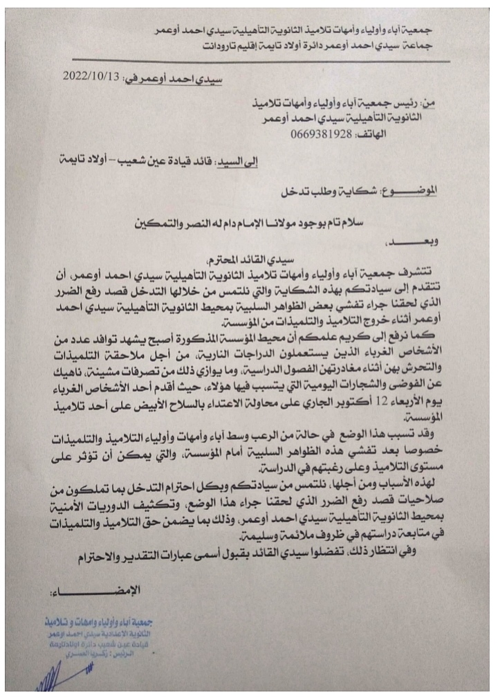كما سلطت الشكاية الضوء على مظاهر الفوضى والشجارات اليومية التي تقع أمام باب المؤسسة، كان آخرها عندما أقدم أحد الأشخاص الغرباء أول أمس الأربعاء على محاولة الاعتداء بالسلاح الأبيض على أحد تلاميذ المؤسسة.