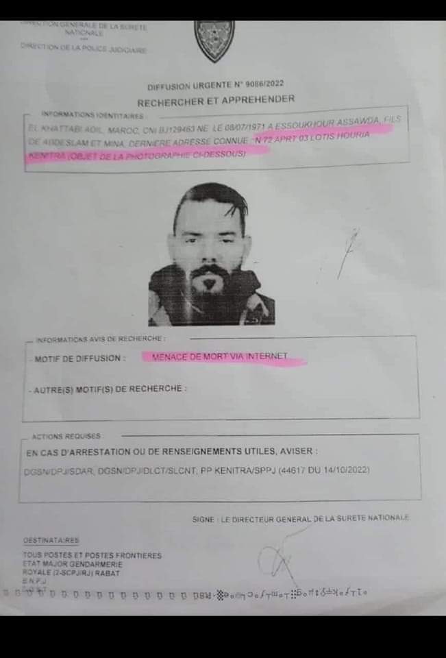 ووفق المعطيات التي توصلت بها الجريدة، فقد تم إصدار مذكرة بحث وطنية في حق المعني بالأمر، من أجل إهانة الشرطة والتهديد بالقتل.