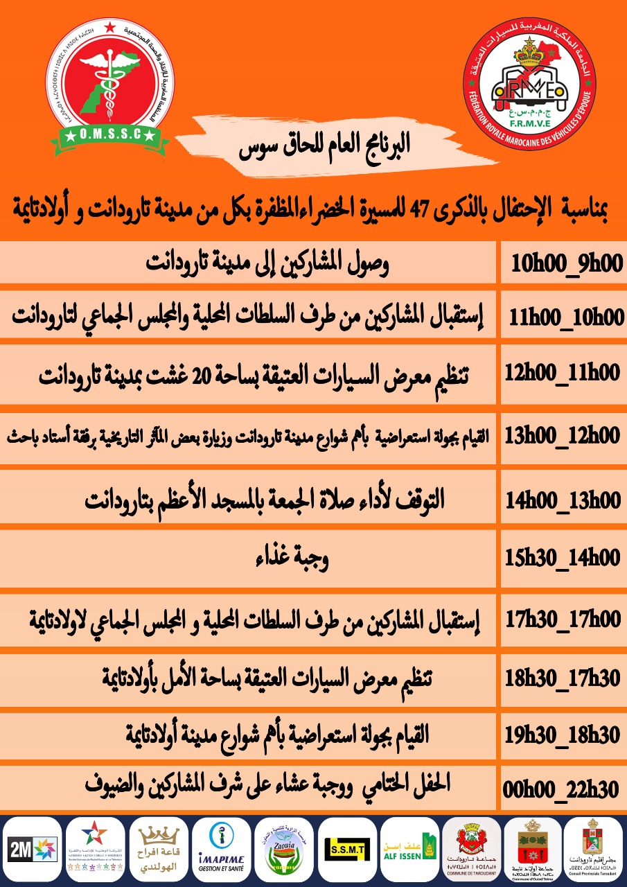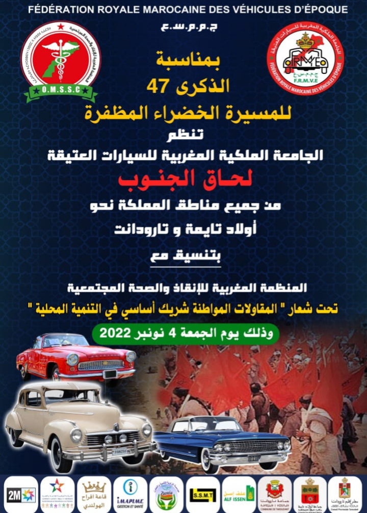 تنظم الجامعة الملكية المغربية للسيارات العتيقة، لحاق سوس للسيارات العتيقة تحت شعار “المقاولات المواطنة شريك أساسي في التنمية المحلية”، وذلك يوم الجمعة 4 نونبر الجاري بمدينتي تارودانت وأولاد تايمة، وذلك في إطار الإحتفالات المخلدة للذكرى 47 للمسيرة الخضراء المظفرة