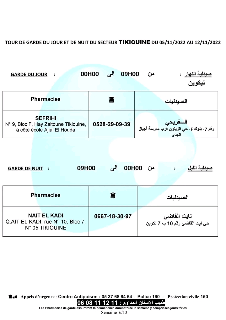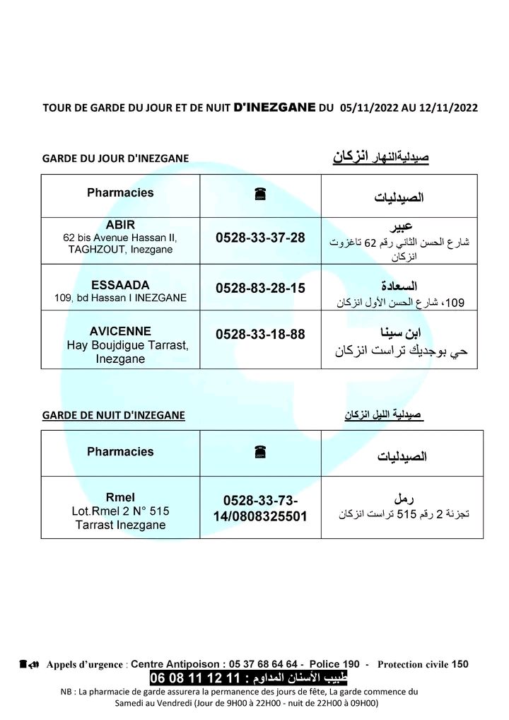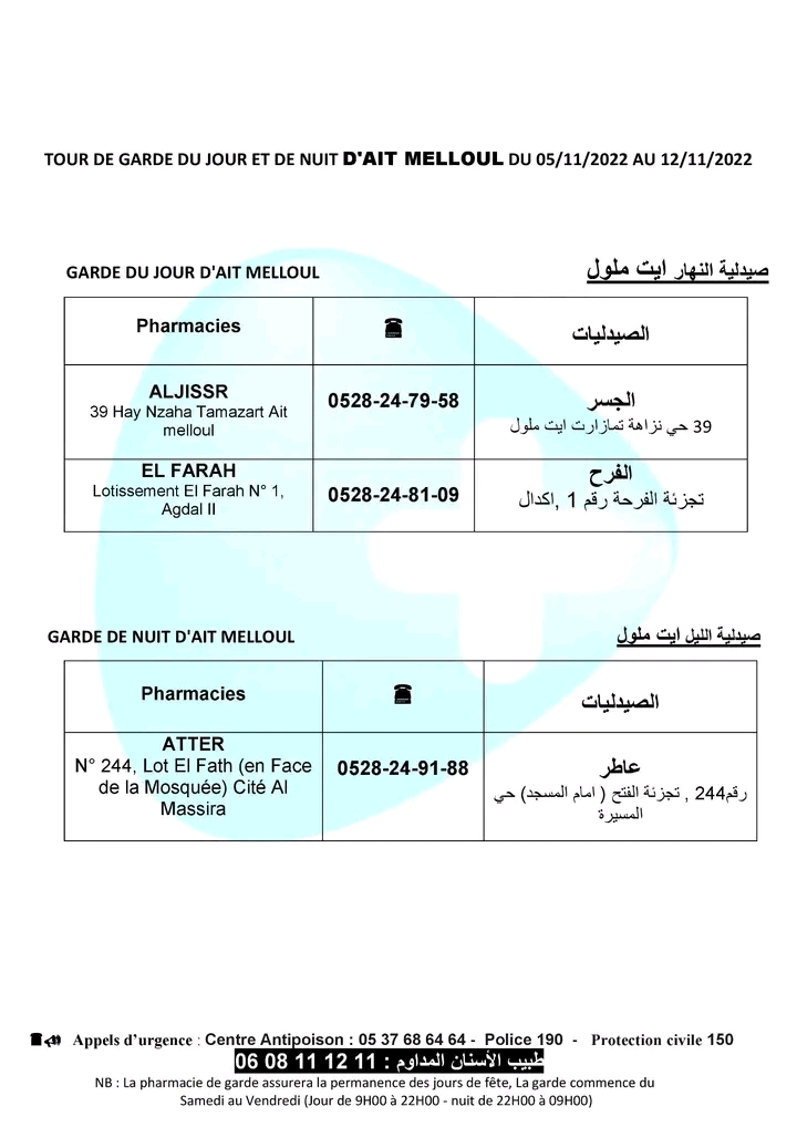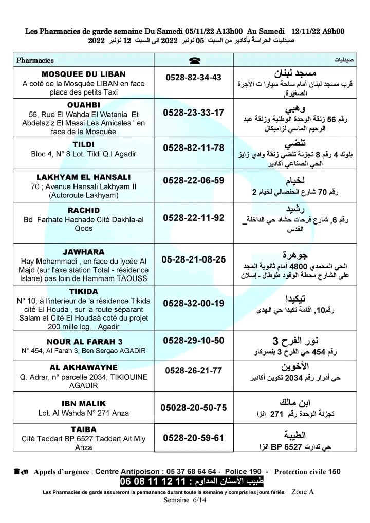 لائحة صيدليات الحراسة لهذا الأسبوع بأكادير وإنزكان وتيكوين وأيت ملول أكاديرإنو 5 نونبر 2022 - 11:33 Facebook Twitter Whatsapp Whatsapp Messenger Messenger Email صيدليات الحراسة بأكادير وإنزكان وتيكوين وأيت ملول، من السبت 05 نونبر 2022 الى السبت 12 نونبر 2022.