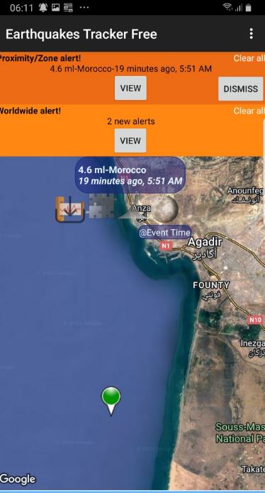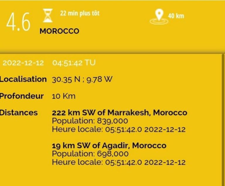 وامتد الزلزال، لمدة 10 ثوان، على عمق 10 كيلومترات من مدينة أكادير، وجاء بقوة 4.6 درجات على سلم “ريشتر”.