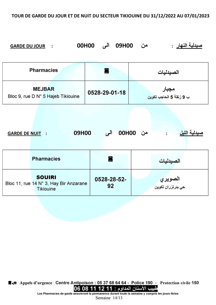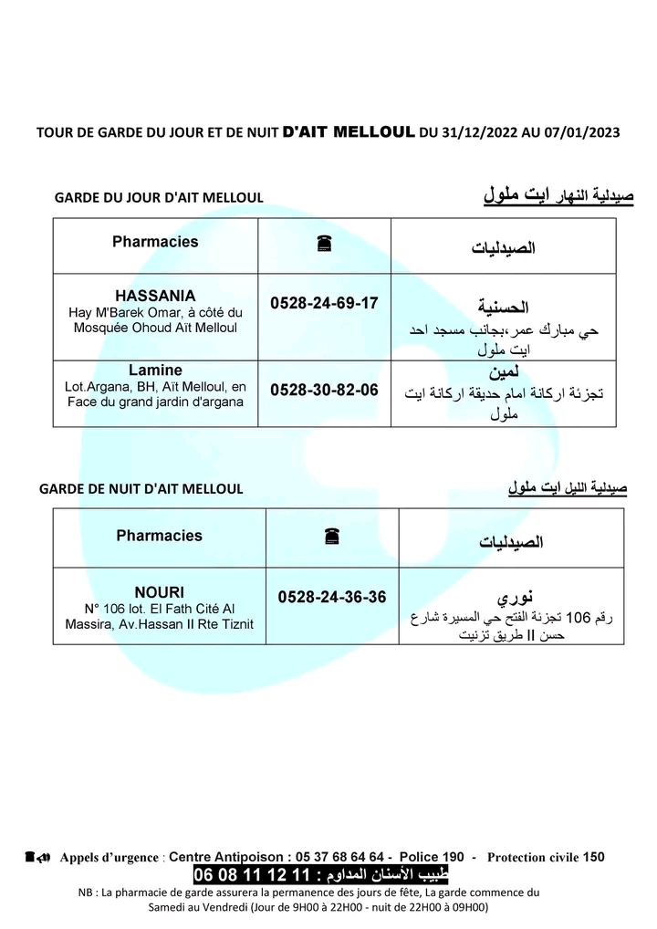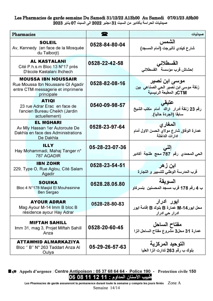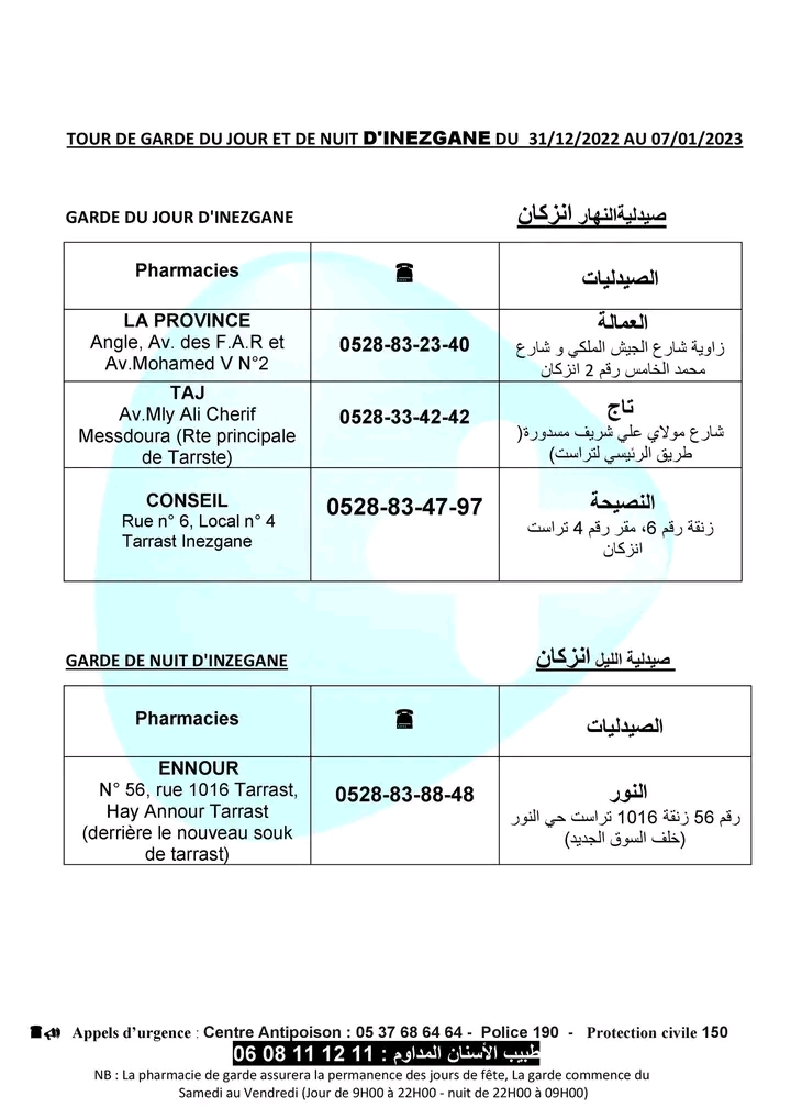 لائحة صيدليات الحراسة لهذا الأسبوع بأكادير وإنزكان وتيكوين وأيت ملول أكاديرإنو 31 دجنبر 2022 - 12:09 Facebook Twitter Whatsapp Whatsapp Messenger Messenger Email صيدليات الحراسة بأكادير وإنزكان وتيكوين وأيت ملول، من السبت 31 دجنبر 2022 الى السبت 07 يناير 2023.