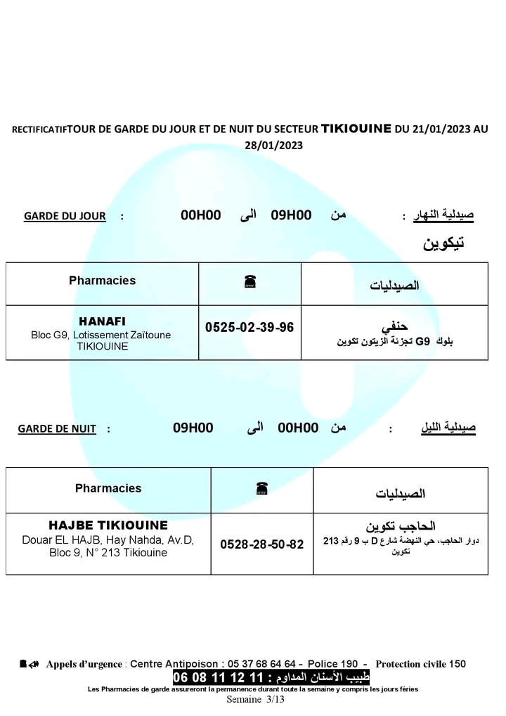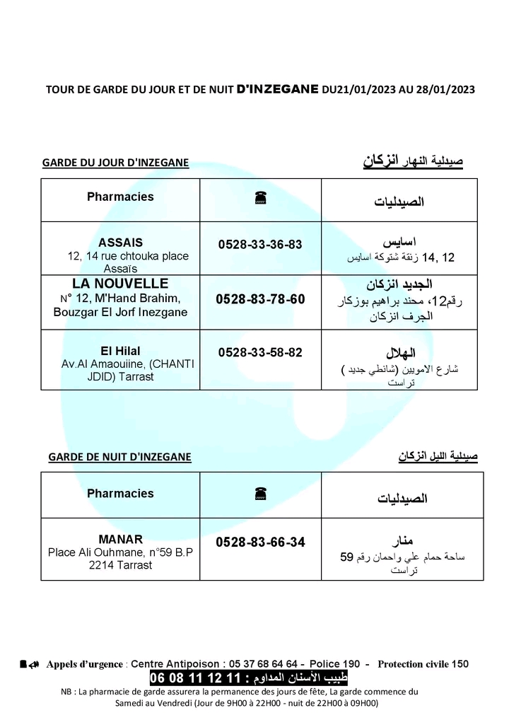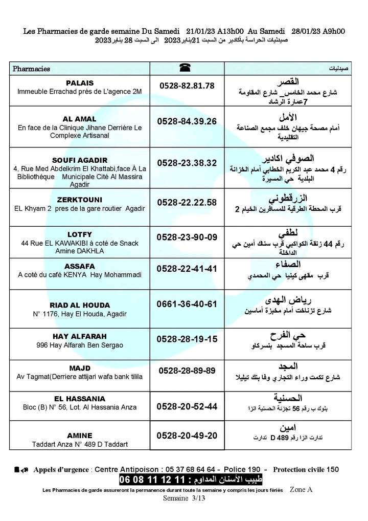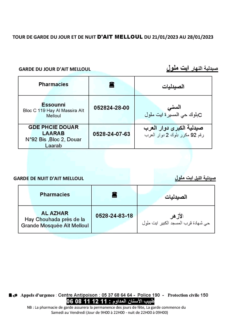 لائحة صيدليات الحراسة لهذا الأسبوع بأكادير وإنزكان وتيكوين وأيت ملول أكاديرإنو 21 يناير 2023 - 11:12 Facebook Twitter Whatsapp Whatsapp Messenger Messenger Email صيدليات الحراسة بأكادير وإنزكان وتيكوين وأيت ملول، من السبت 21 يناير 2023 الى السبت 28 يناير 2023.