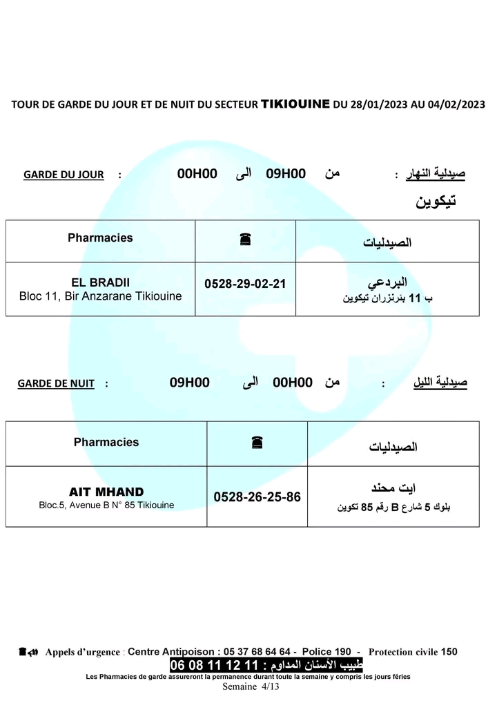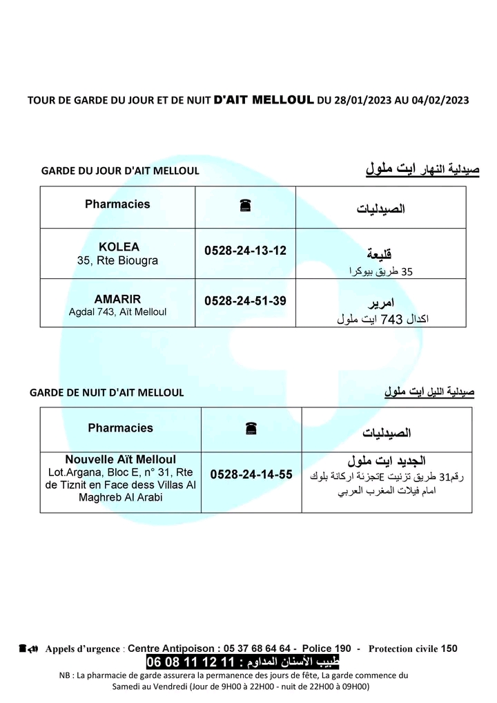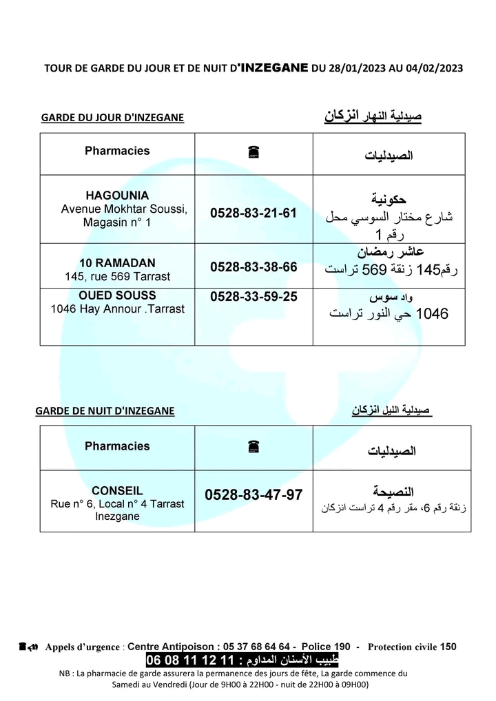 لائحة صيدليات الحراسة لهذا الأسبوع بأكادير وإنزكان وتيكوين وأيت ملول أكاديرإنو 28 يناير 2023 - 16:17 Facebook Twitter Whatsapp Whatsapp Messenger Messenger Email صيدليات الحراسة بأكادير وإنزكان وتيكوين وأيت ملول، من السبت 28 يناير 2023 الى السبت 4 فبراير 2023.