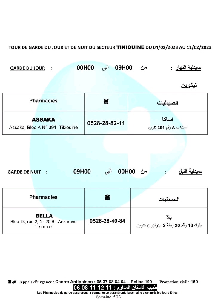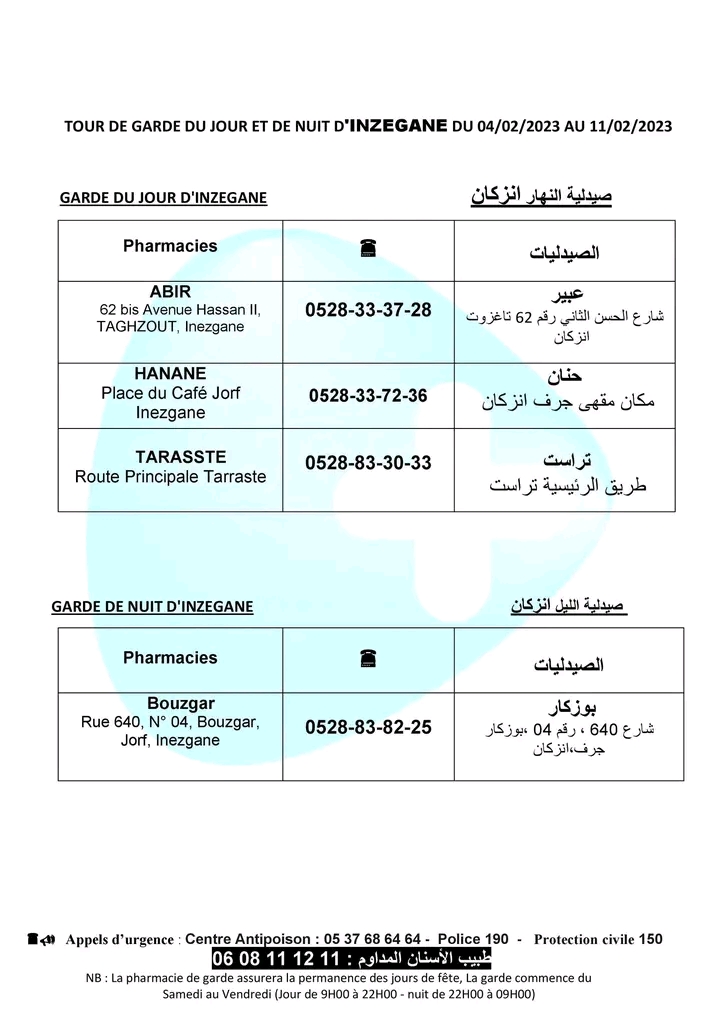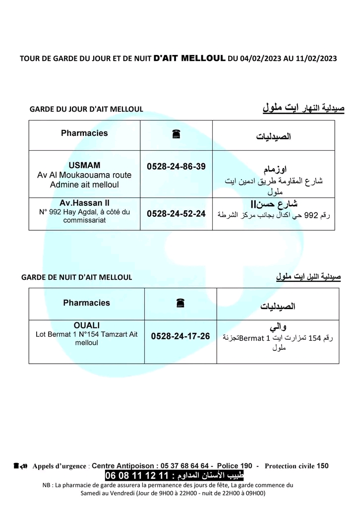 لائحة صيدليات الحراسة لهذا الأسبوع بأكادير وإنزكان وتيكوين وأيت ملول أكاديرإنو 4 فبراير 2023 - 11:46 Facebook Twitter Whatsapp Whatsapp Messenger Messenger Email صيدليات الحراسة بأكادير وإنزكان وتيكوين وأيت ملول، من السبت 4 فبراير 2023 إلى السبت 11 فبراير 2023.