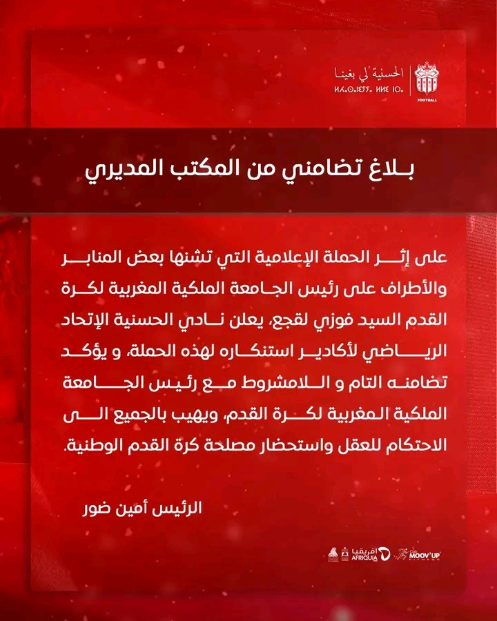عبر المكتب المديري لنادي حسنية أكادير لكرة القدم، عن تضامنه مع فوزي لقجع رئيس الجامعة الملكية المغربية لكرة القدم، على إثر الحملة الإعلامية التي تشنها بعض المنابر والأطراف.