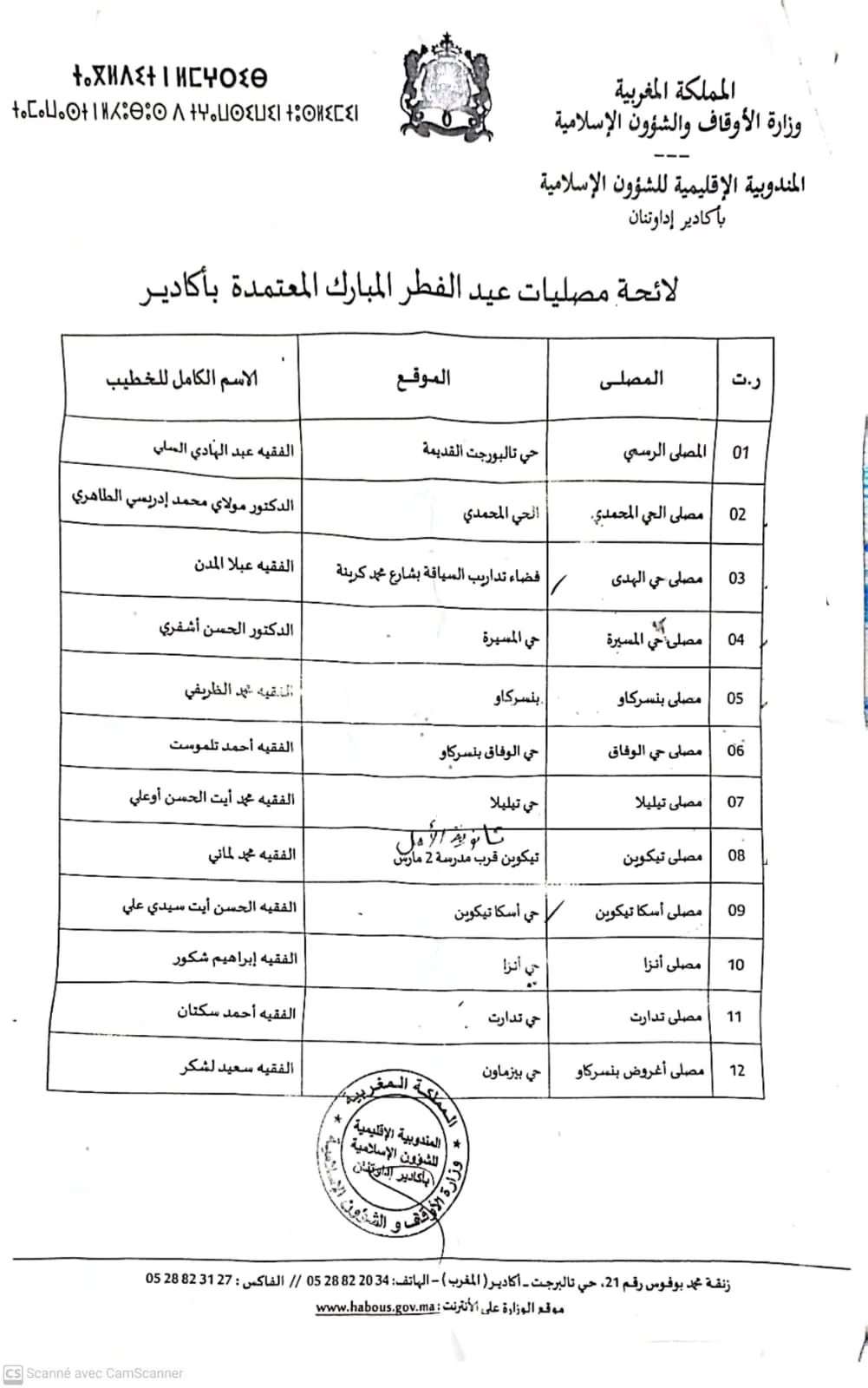 وحسب الإعلان الذي تتوفر جريدة “أكاديرإنو” على نسخة منه فإن المصليات المعنية بأداء صلاة عيد الفطر بمدينة أكادير، تشمل المصلى الرسمي بحي تالبرجت القديمة والحي المحمدي وحي الهدى والمسيرة وبنسركاو والوفاق، إضافة إلى مصلى تيليلا وتيكوين وأساكا، وأنزا وتدارت وأغروض بنسركاو.