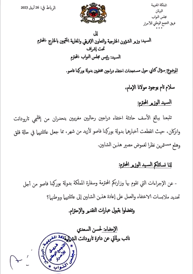 وتسائل النائب البرلماني عن دائرة تارودانت الشمالية، عن الإجراءات التي تقوم بها وزارة الشؤون الخارجية وسفارة المملكة بولة بوركينافاصو من أجل تحديد ملابسات الاختفاء والعمل على إعادة هذين الشابين إلى عائلتيهما ووطنهما.