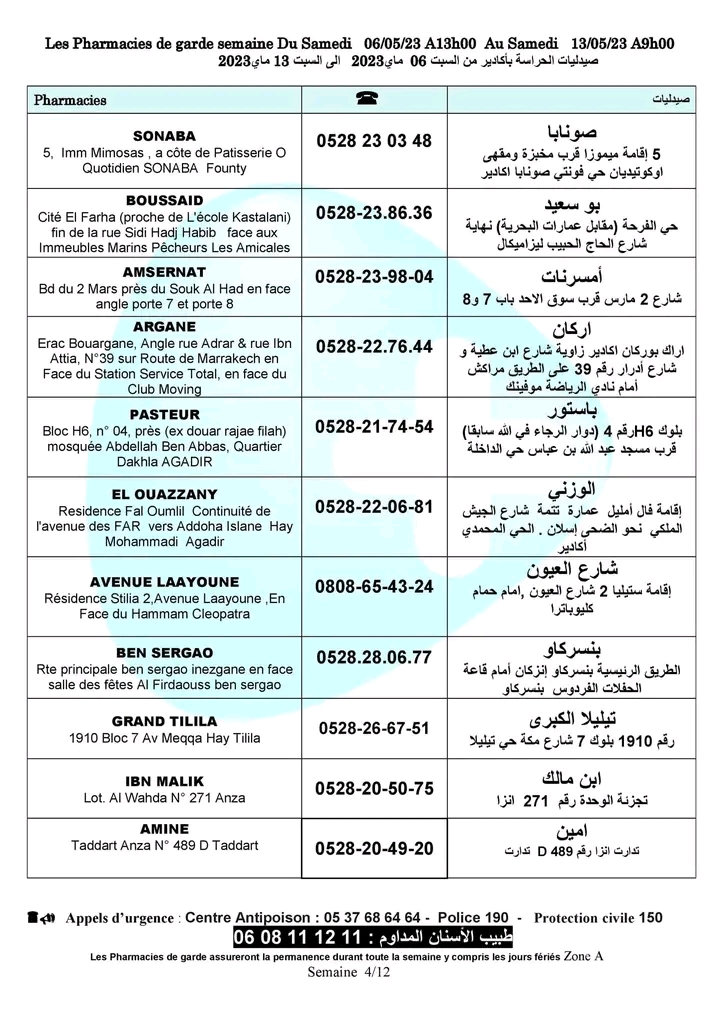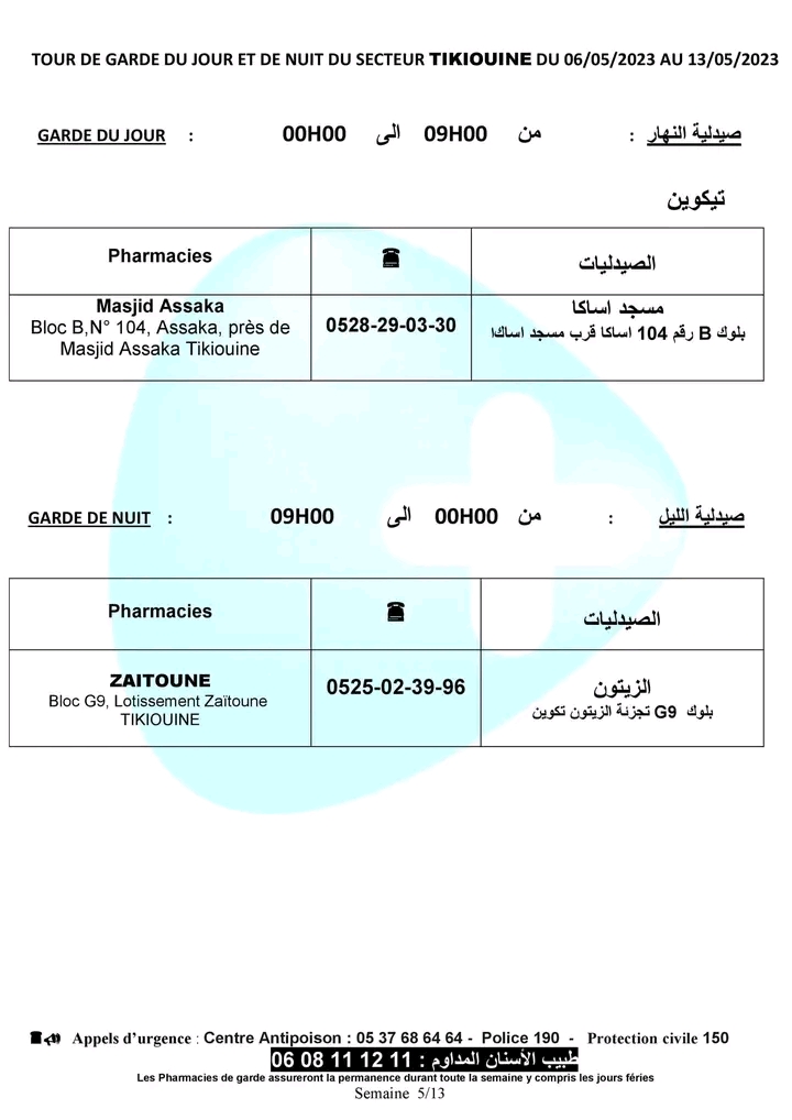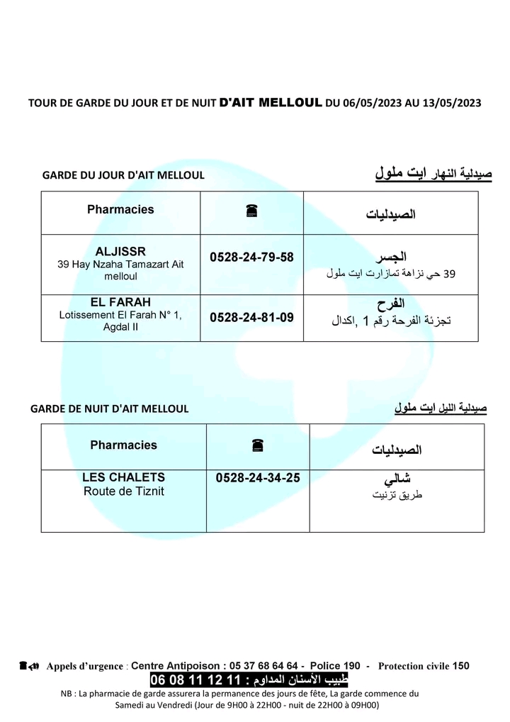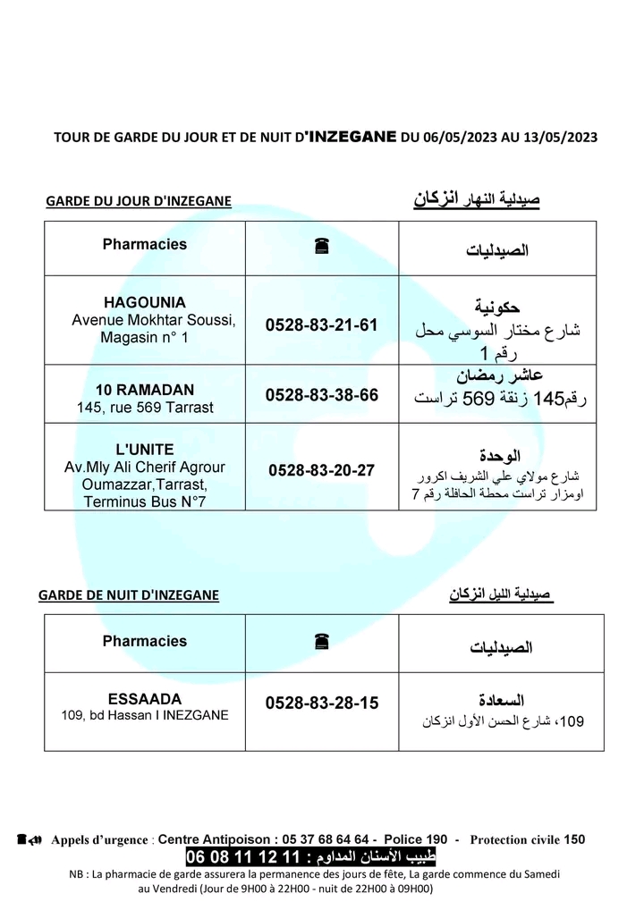 لائحة صيدليات الحراسة لهذا الأسبوع بأكادير وإنزكان وتيكوين وأيت ملول أكاديرإنو 6 ماي 2023 - 10:00 Facebook Twitter Whatsapp Whatsapp Messenger Messenger Email صيدليات الحراسة بأكادير وإنزكان وتيكوين وأيت ملول، من السبت 5 ماي 2023 إلى السبت 13 ماي 2023.