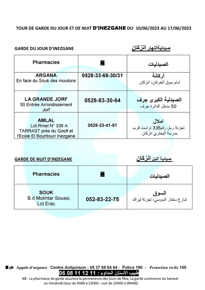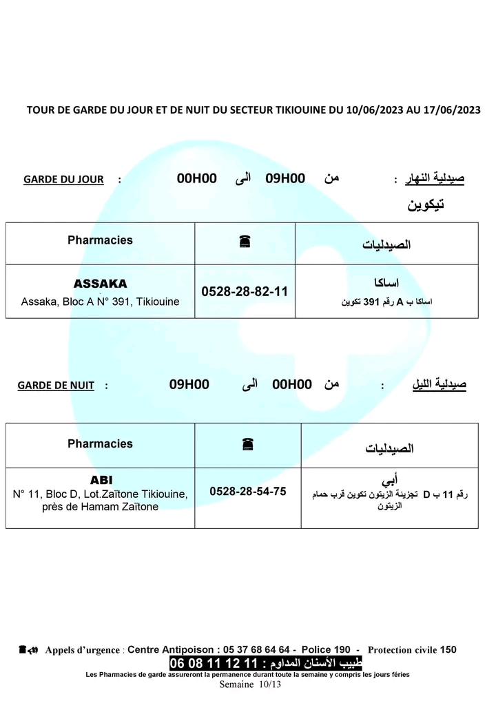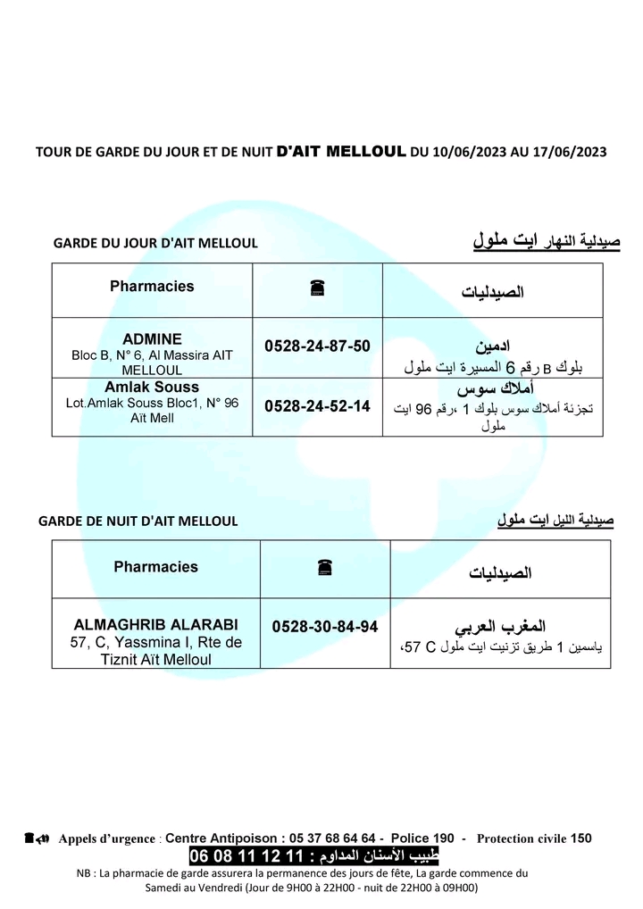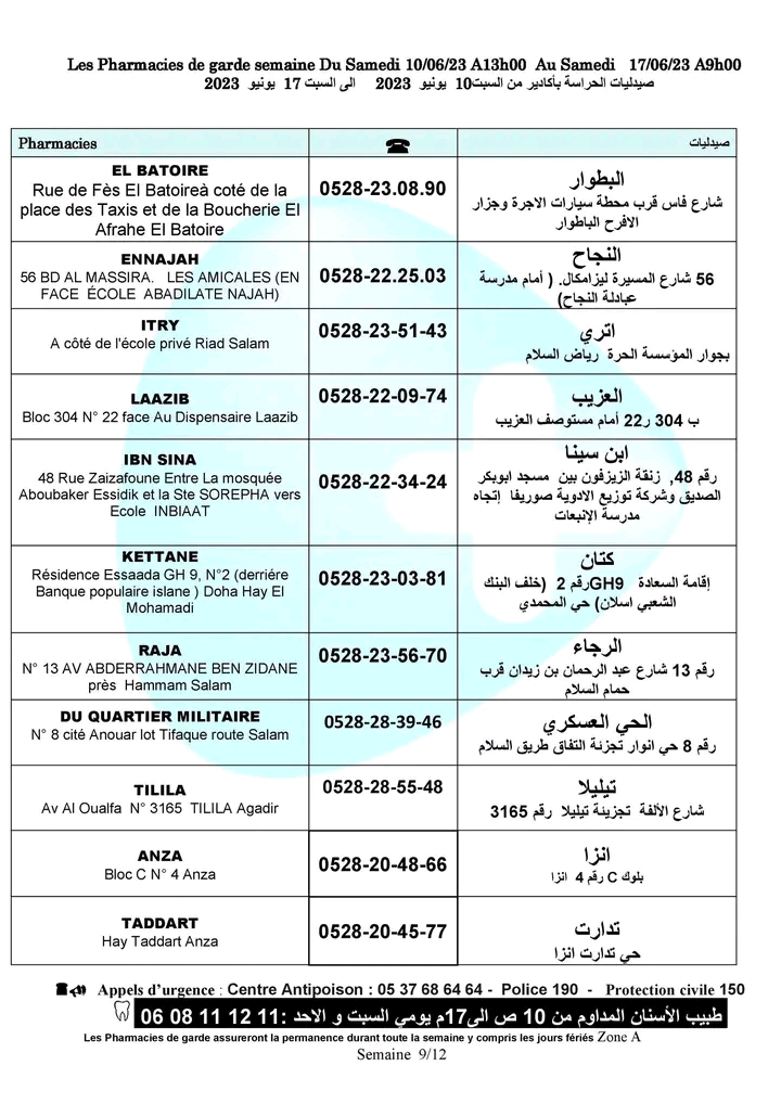 لائحة صيدليات الحراسة لهذا الأسبوع بأكادير وإنزكان وتيكوين وأيت ملول أكاديرإنو 10 يونيو 2023 - 10:31 Facebook Twitter Whatsapp Whatsapp Messenger Messenger Email صيدليات الحراسة بأكادير وإنزكان وتيكوين وأيت ملول، من السبت 10 يونيو 2023 إلى السبت 17 يونيو 2023.