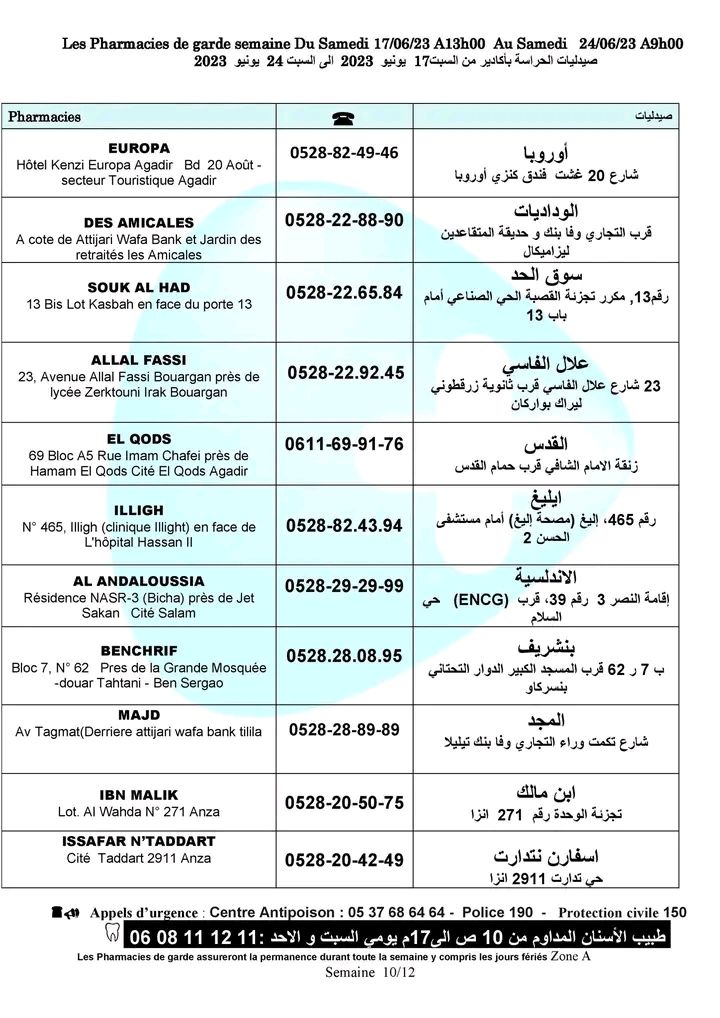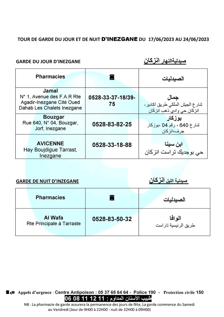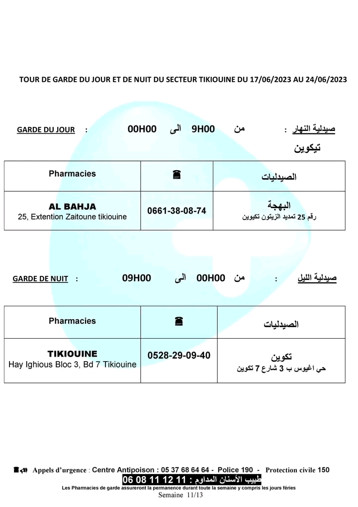 لائحة صيدليات الحراسة لهذا الأسبوع بأكادير وإنزكان وتيكوين وأيت ملول أكاديرإنو 17 يونيو 2023 - 13:58 Facebook Twitter Whatsapp Whatsapp Messenger Messenger Email صيدليات الحراسة بأكادير وإنزكان وتيكوين وأيت ملول، من السبت 17 يونيو 2023 إلى السبت 24 يونيو 2023.