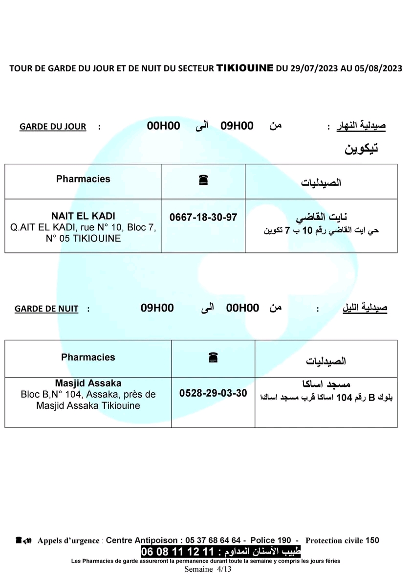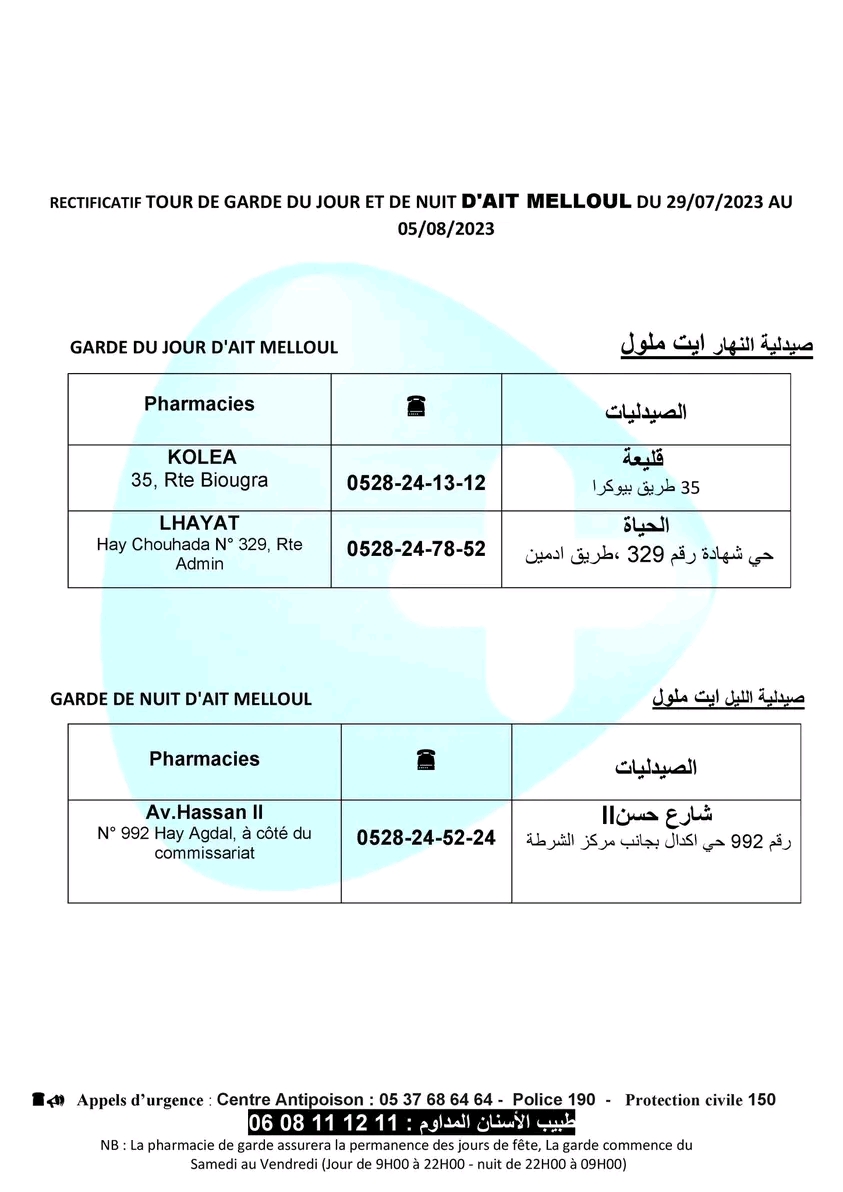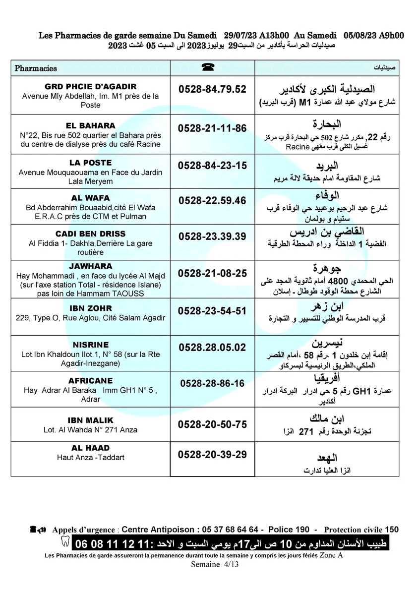 صيدليات الحراسة بأكادير وإنزكان وتيكوين وأيت ملول، من السبت 29 يوليوز 2023 إلى السبت 05 غشت 2023.