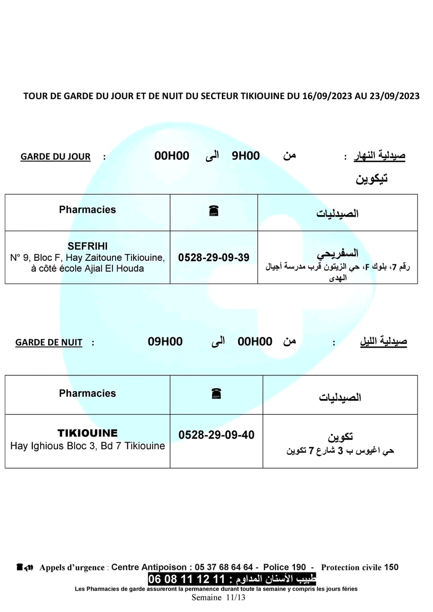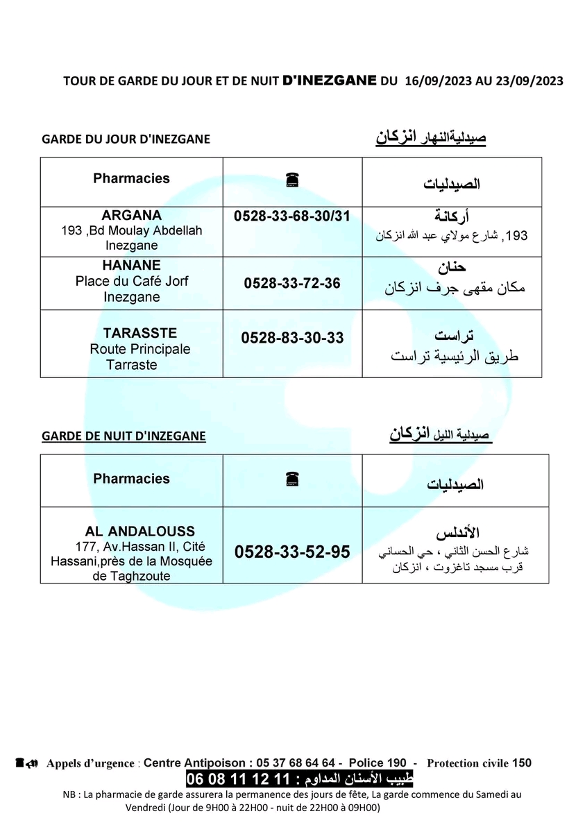 لائحة صيدليات الحراسة لهذا الأسبوع بأكادير وإنزكان وتيكوين وأيت ملول أكاديرإنو 16 شتنبر 2023 - 10:13 Facebook Twitter Whatsapp Whatsapp Messenger Messenger Email صيدليات الحراسة بأكادير وإنزكان وتيكوين وأيت ملول، من السبت 16 شتنبر 2023 إلى السبت 23 شتنبر 2023.