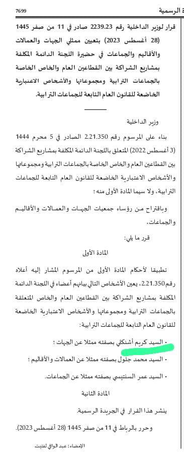 تم تعيين كريم اشنكلي، رئيس جهة سوس ماسة، عضوا باللجنة الدائمة المكلفة بمشاريع الشراكة بين القطاعين العام والخاص الخاصة بالجماعات الترابية ومجموعاتها والاشخاص الاعتبارية الخاضعة للقانون العام التابعة للجماعات الترابية.