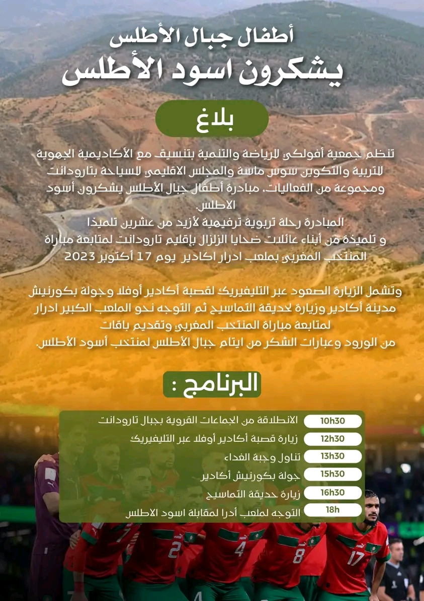 في مبادرة إنسانية وتضامنية، نظمت جمعية إفولكي للرياضة والتنمية بتنسيق مع الأكاديمية الجهوية للتربية والتكوين لجهة سوس ماسة، والمجلس الإقليمي للسياحة بتارودانت، ومجموعة من الفعاليات، مبادرة أطفال جبال الأطلس يشكرون أسود الأطلس.