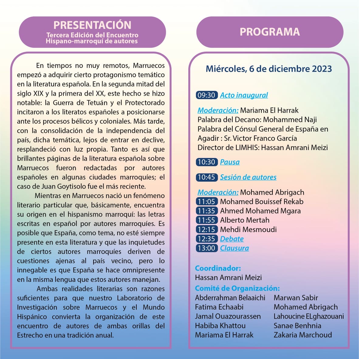 من المرتقب أن يحتضن مختبر البحث حول المغرب والعالم الإسباني LIMHIS، التابع لشعبة الدراسات الإسبانية بكلية الآداب والعلوم الإنسانية بجامعة ابن زهر بأكادير الملتقى المغربي-الإسباني الثالث للكتّاب برحاب فضاء الانسانيات بكلية الآداب والعلوم الانسانية، وذلك يوم 6 دجنبر المقبل.