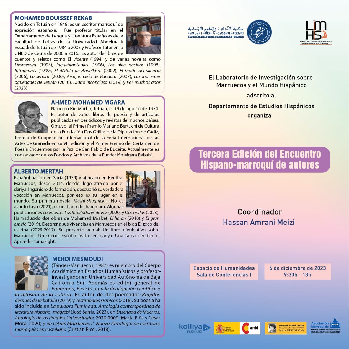 من المرتقب أن يحتضن مختبر البحث حول المغرب والعالم الإسباني LIMHIS، التابع لشعبة الدراسات الإسبانية بكلية الآداب والعلوم الإنسانية بجامعة ابن زهر بأكادير الملتقى المغربي-الإسباني الثالث للكتّاب برحاب فضاء الانسانيات بكلية الآداب والعلوم الانسانية، وذلك يوم 6 دجنبر المقبل.