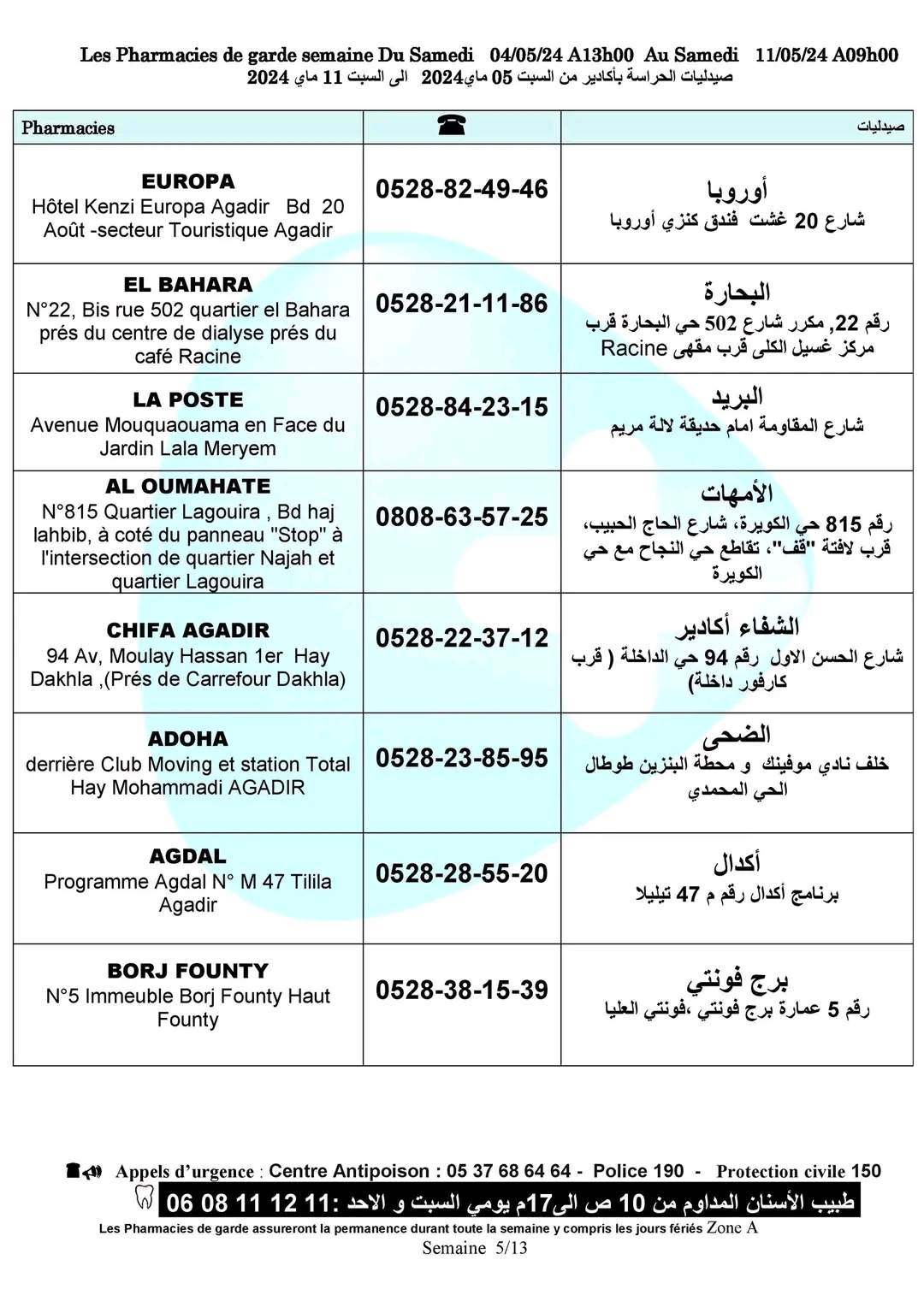 لائحة صيدليات الحراسة لهذا الأسبوع بأكادير وإنزكان وأيت ملول وتيكوين أكاديرإنو 4 ماي 2024 - 14:05 Facebook Twitter Whatsapp Whatsapp Messenger Messenger Email صيدليات الحراسة بأكادير وإنزكان وتيكوين وأيت ملول، من السبت 4 ماي الجاري على الساعة الواحدة زوالا، إلى السبت 11 ماي المقبل على الساعة التاسعة صباحا.