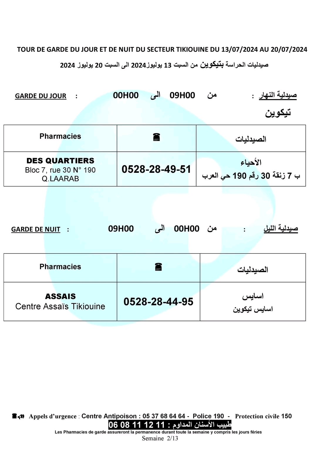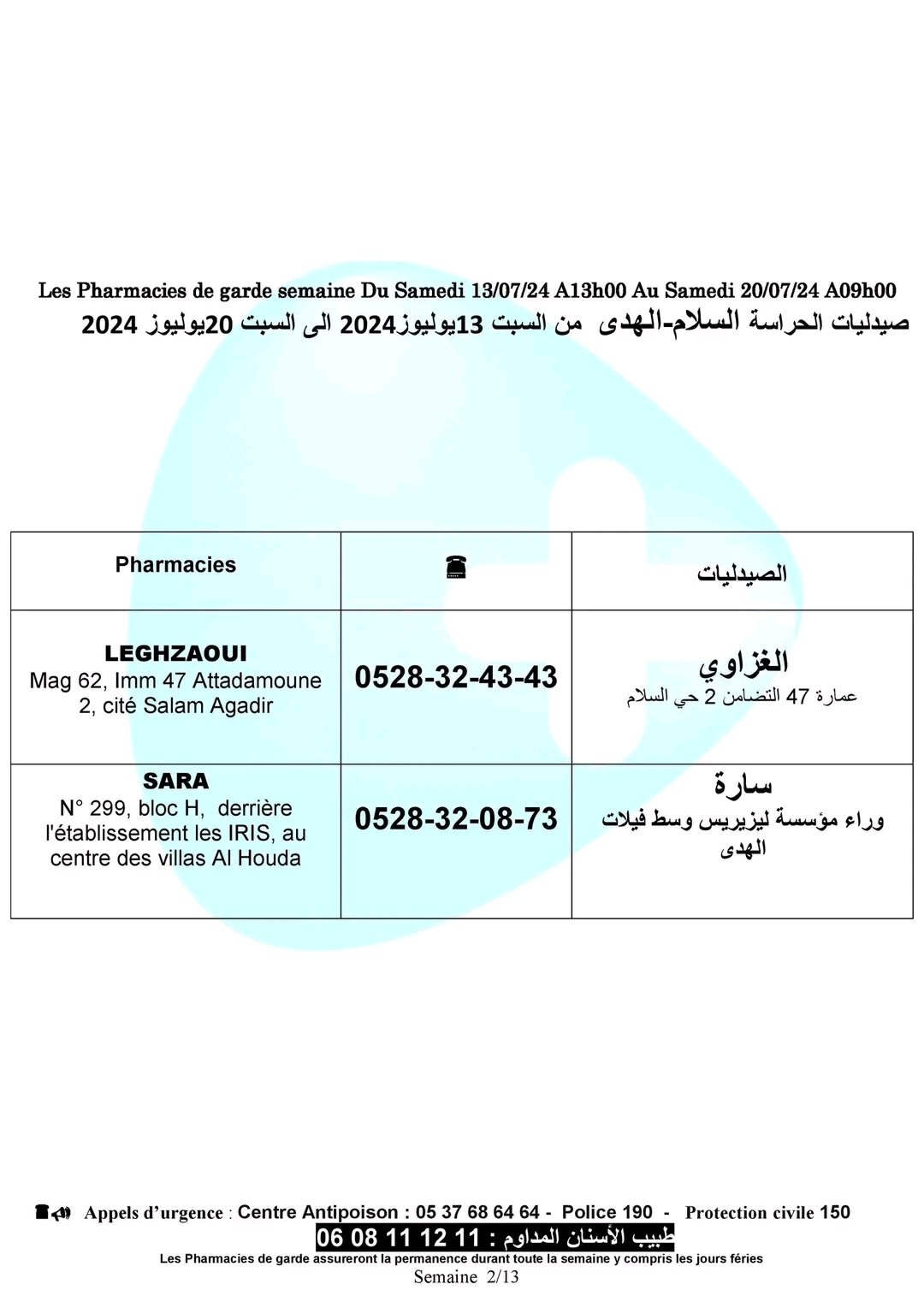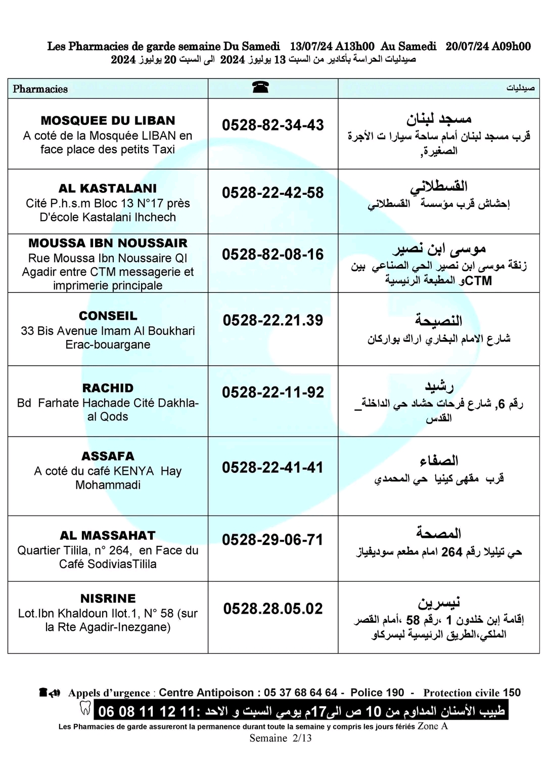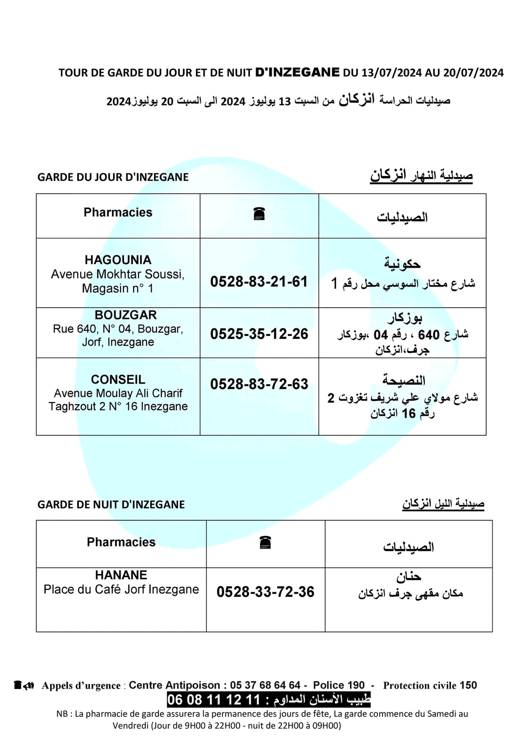 صيدليات الحراسة بأكادير وإنزكان وتيكوين وأيت ملول، من السبت 13 يوليوز الجاري على الساعة الواحدة زوالا، إلى السبت 20 يوليوز الجاري على الساعة التاسعة صباحا.