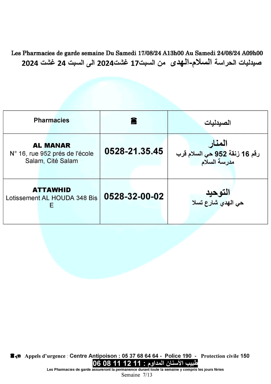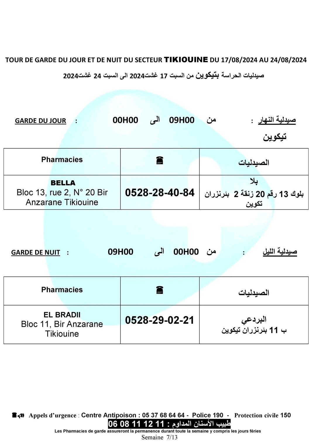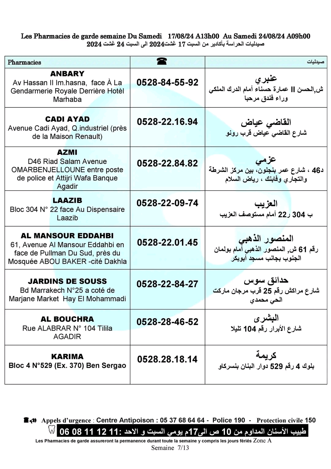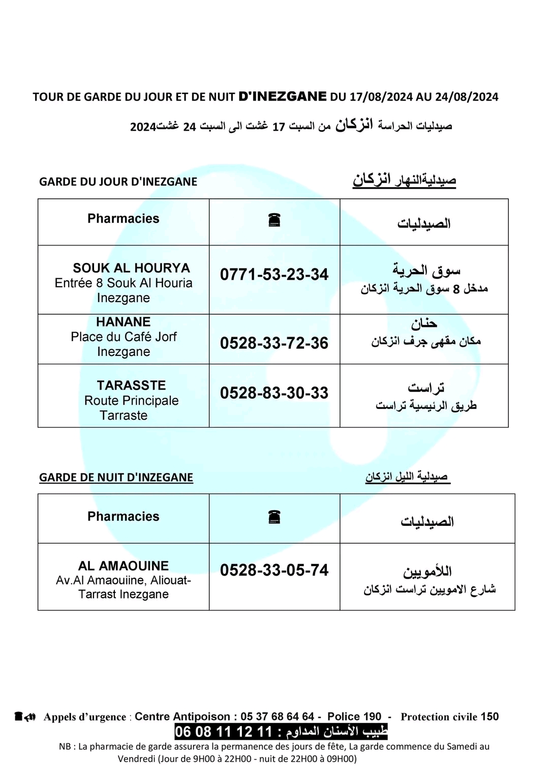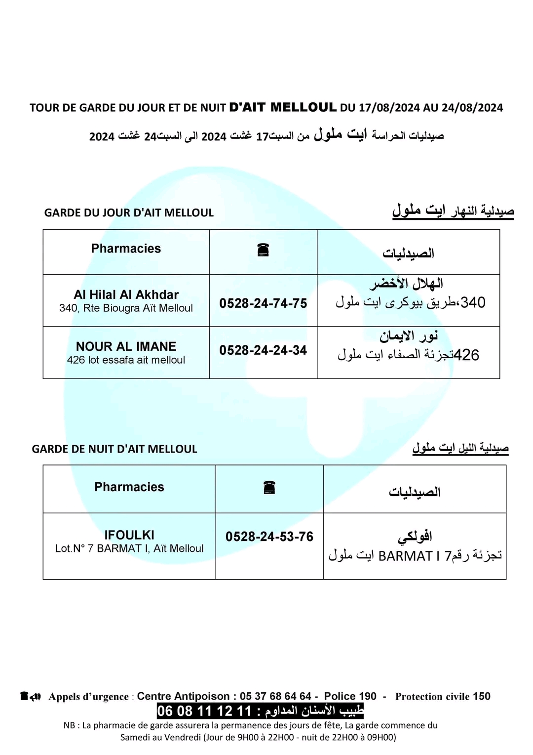 لائحة صيدليات الحراسة لهذا الأسبوع بأكادير وإنزكان وأيت ملول وتيكوين أكاديرإنو 17 غشت 2024 - 12:34 Facebook Twitter Whatsapp Whatsapp Messenger Messenger Email صيدليات الحراسة بأكادير وإنزكان وتيكوين وأيت ملول، من السبت 17 غشت الجاري على الساعة الواحدة زوالا، إلى السبت 24 غشت الجاري على الساعة التاسعة صباحا.
