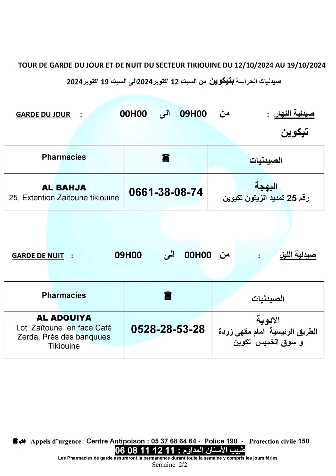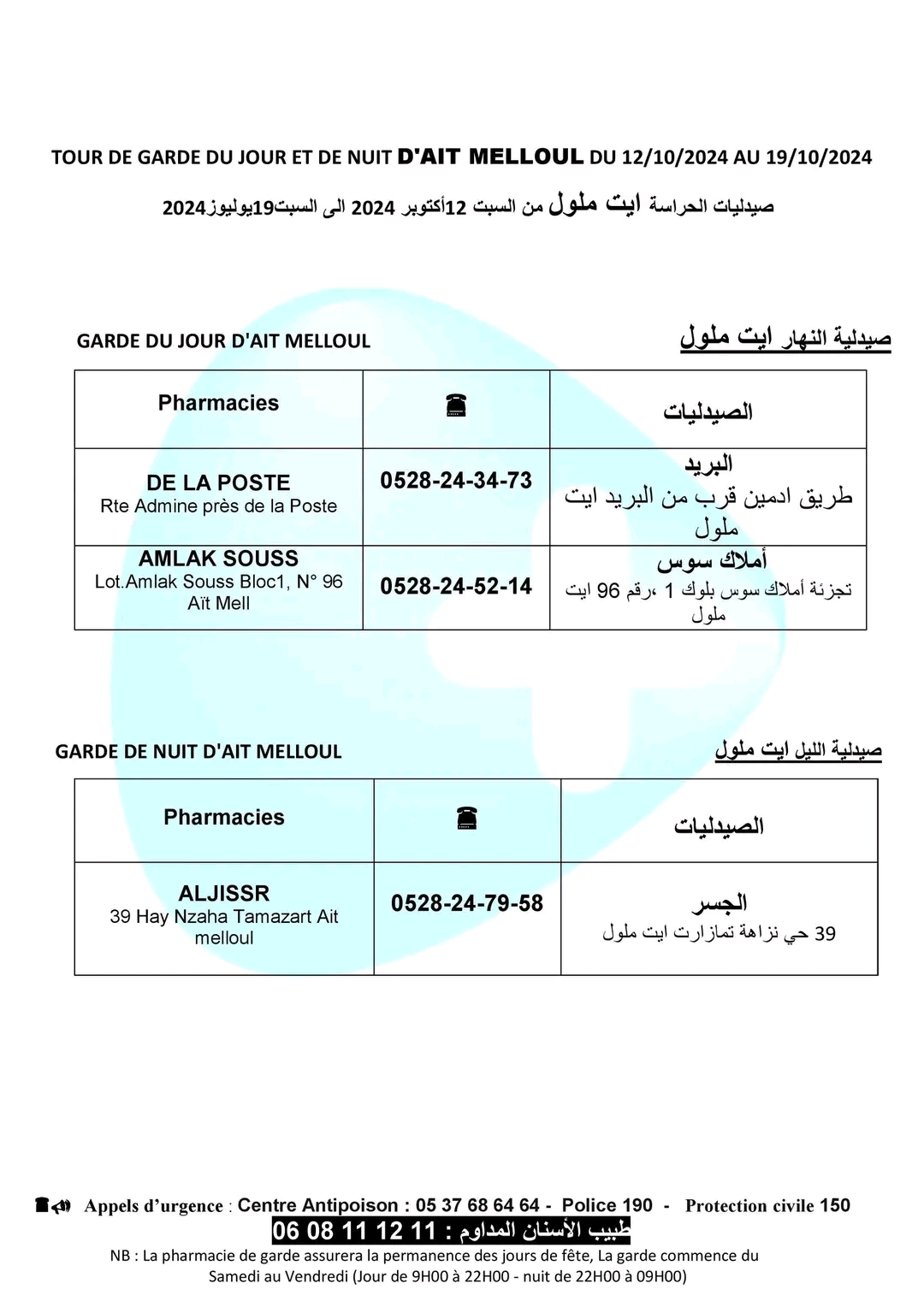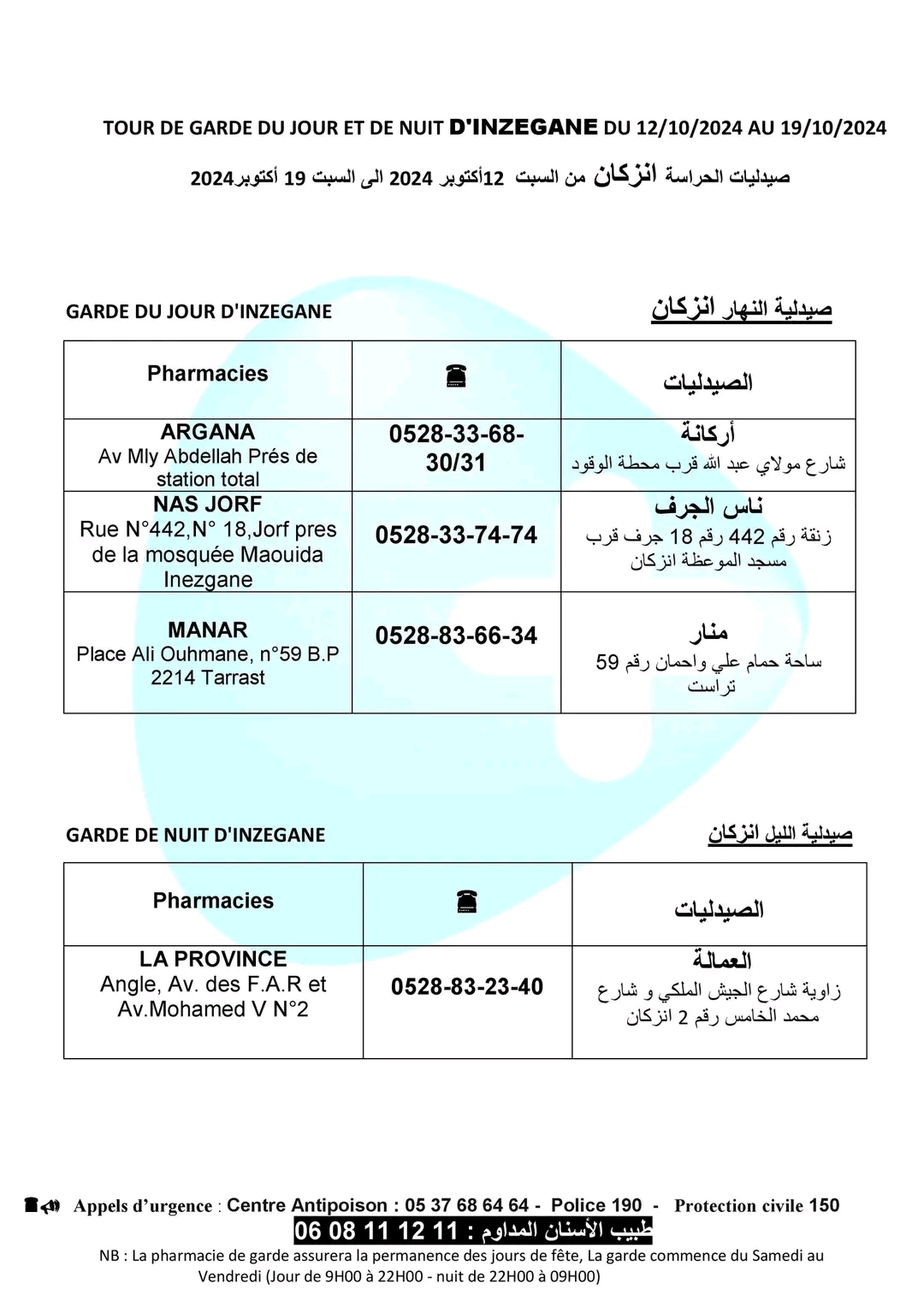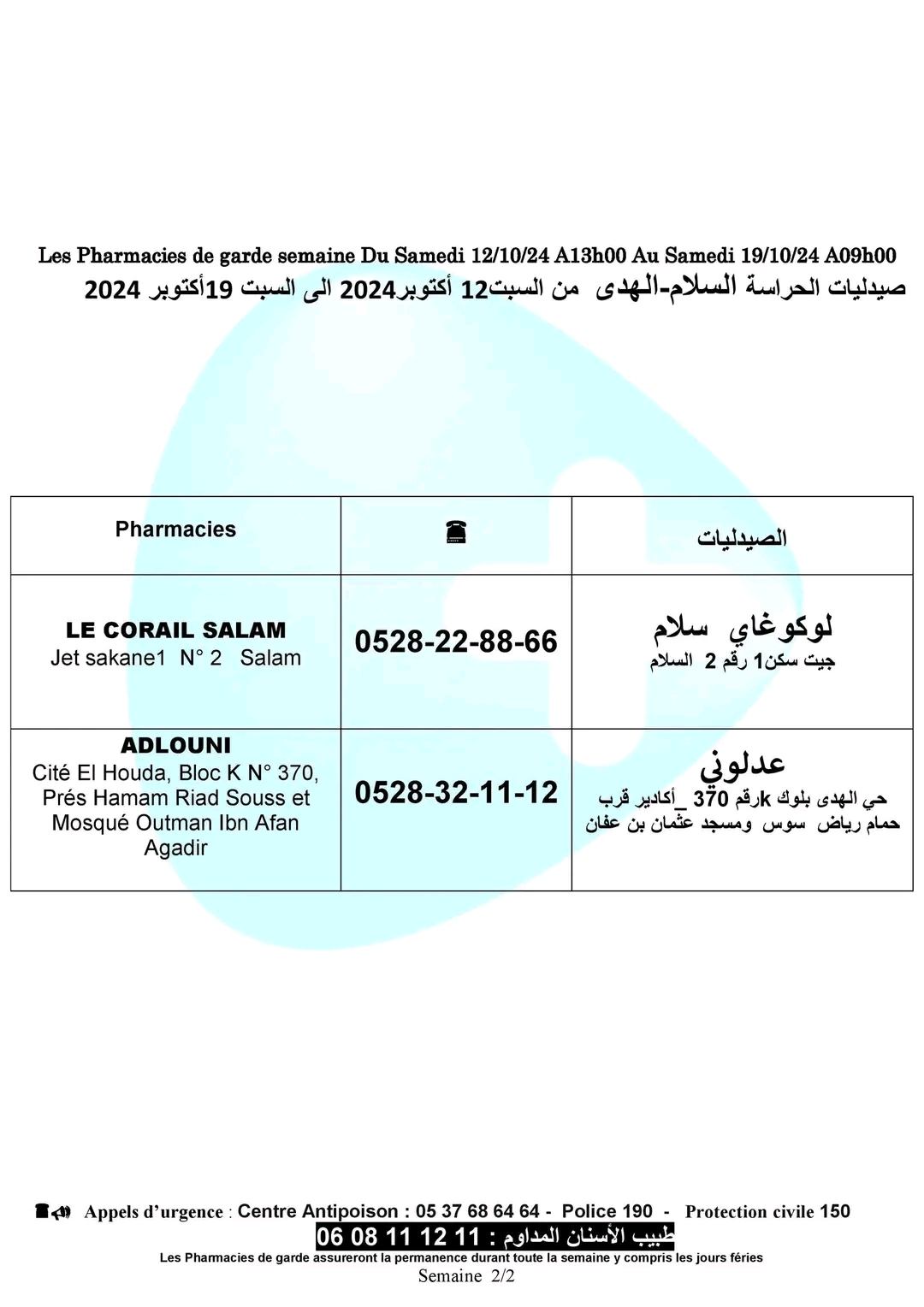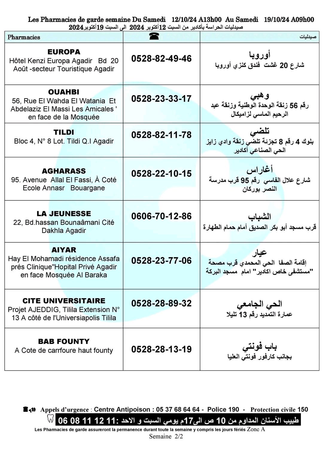 لائحة صيدليات الحراسة لهذا الأسبوع بأكادير وإنزكان وأيت ملول وتيكوين أكاديرإنو 12 أكتوبر 2024 - 11:36 Facebook Twitter Whatsapp Whatsapp Messenger Messenger Email صيدليات الحراسة بأكادير وإنزكان وتيكوين وأيت ملول، من السبت 12 أكتوبر 2024 على الساعة الواحدة زوالا، إلى السبت 19 أكتوبر 2024 على الساعة التاسعة صباحا.