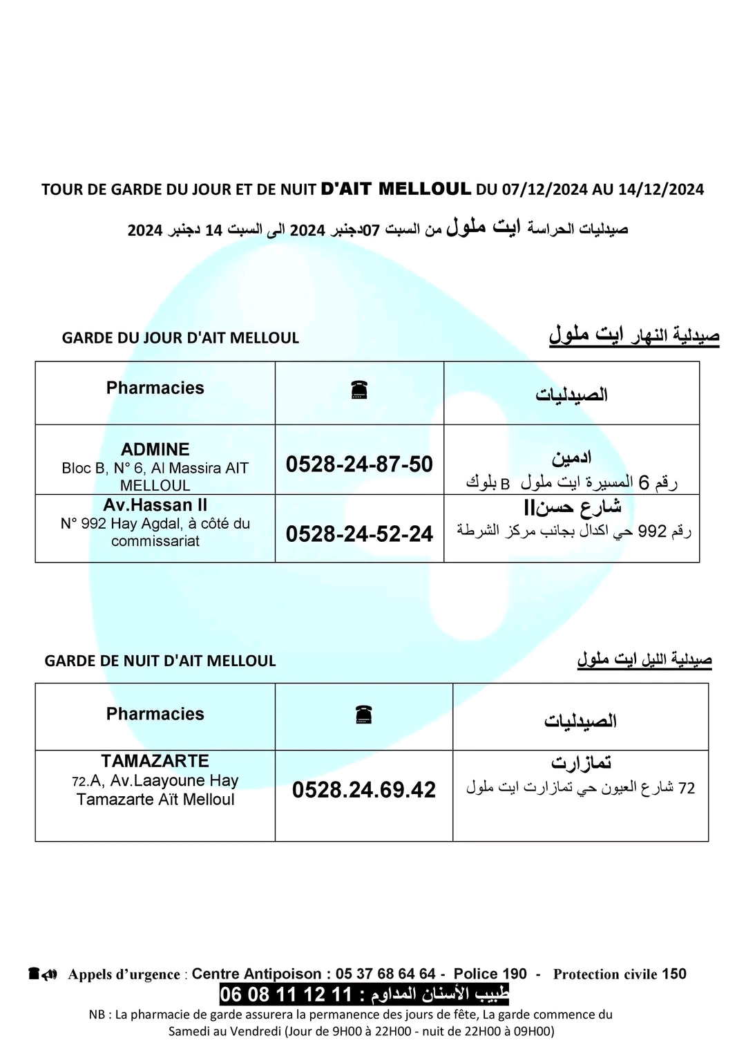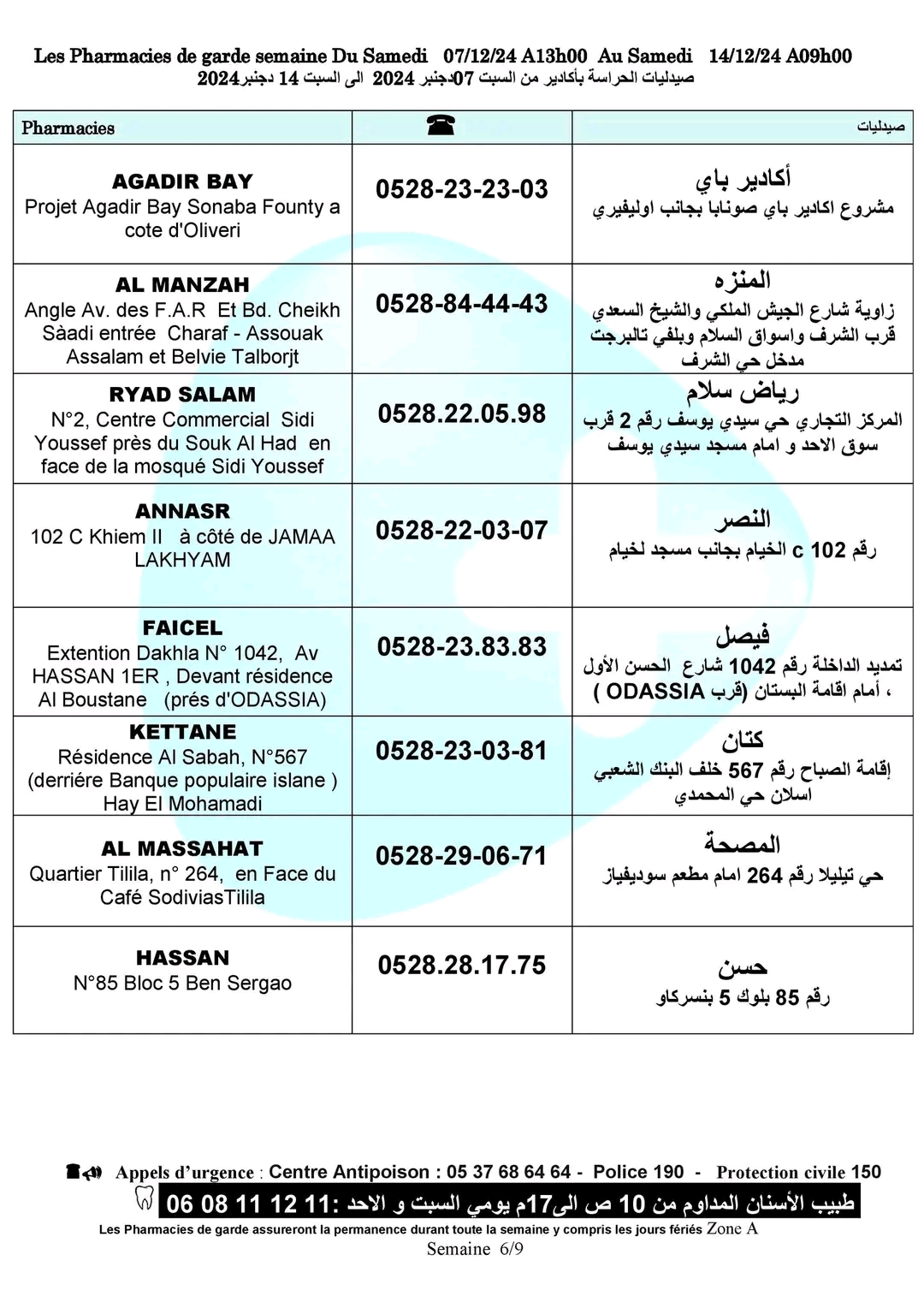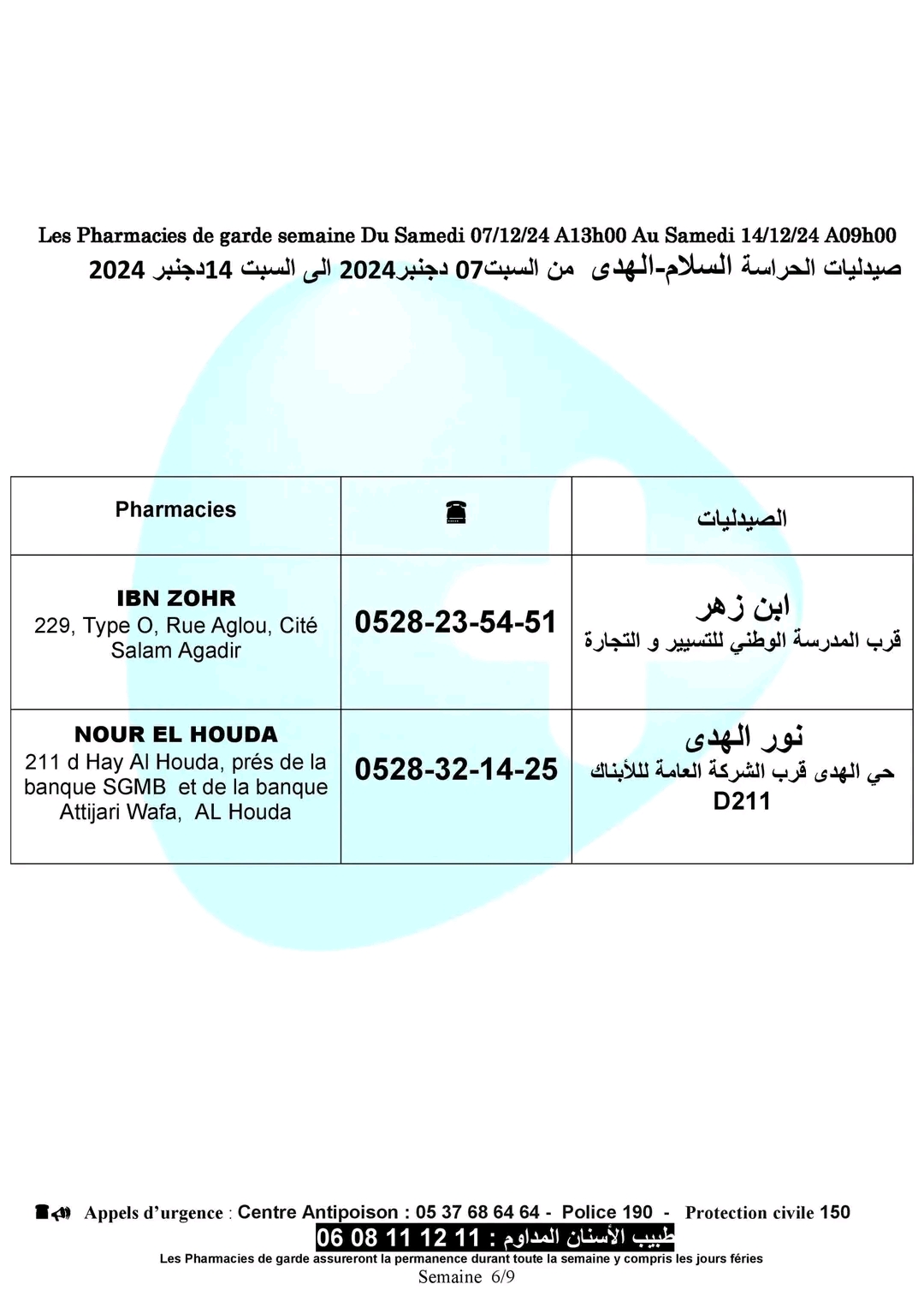 لائحة صيدليات الحراسة لهذا الأسبوع بأكادير وإنزكان وأيت ملول وتيكوين أكاديرإنو 7 دجنبر 2024 - 12:55 Facebook Twitter Whatsapp Whatsapp Messenger Messenger Email صيدليات الحراسة بأكادير وإنزكان وتيكوين وأيت ملول، من السبت 07 دجنبر 2024 على الساعة الواحدة زوالا، إلى السبت 14 دجنبر 2024 على الساعة التاسعة صباحا.