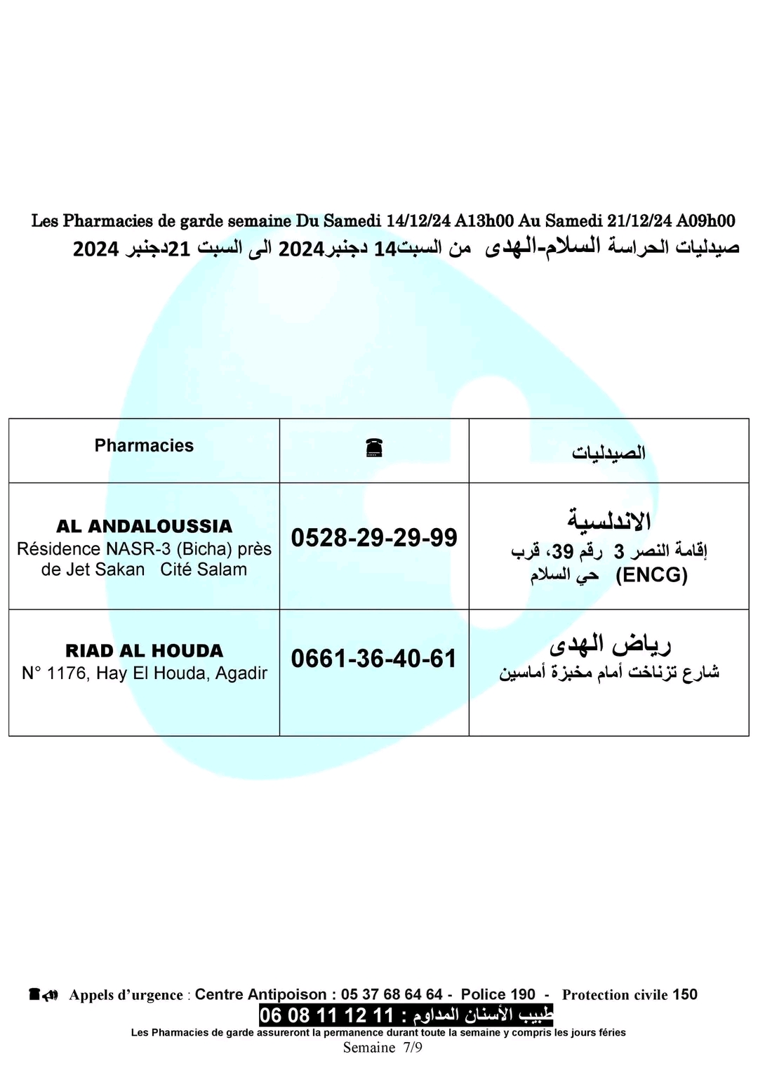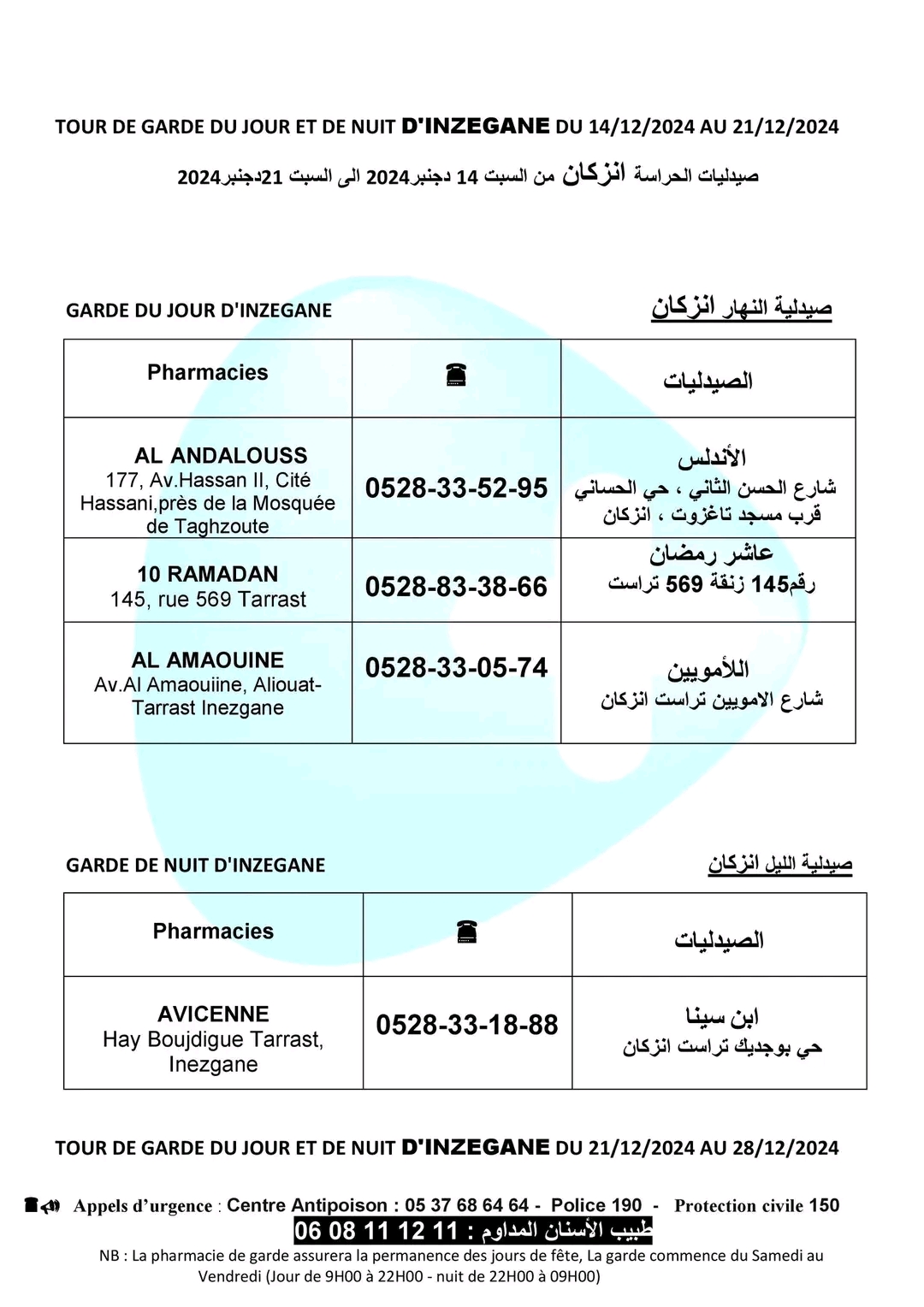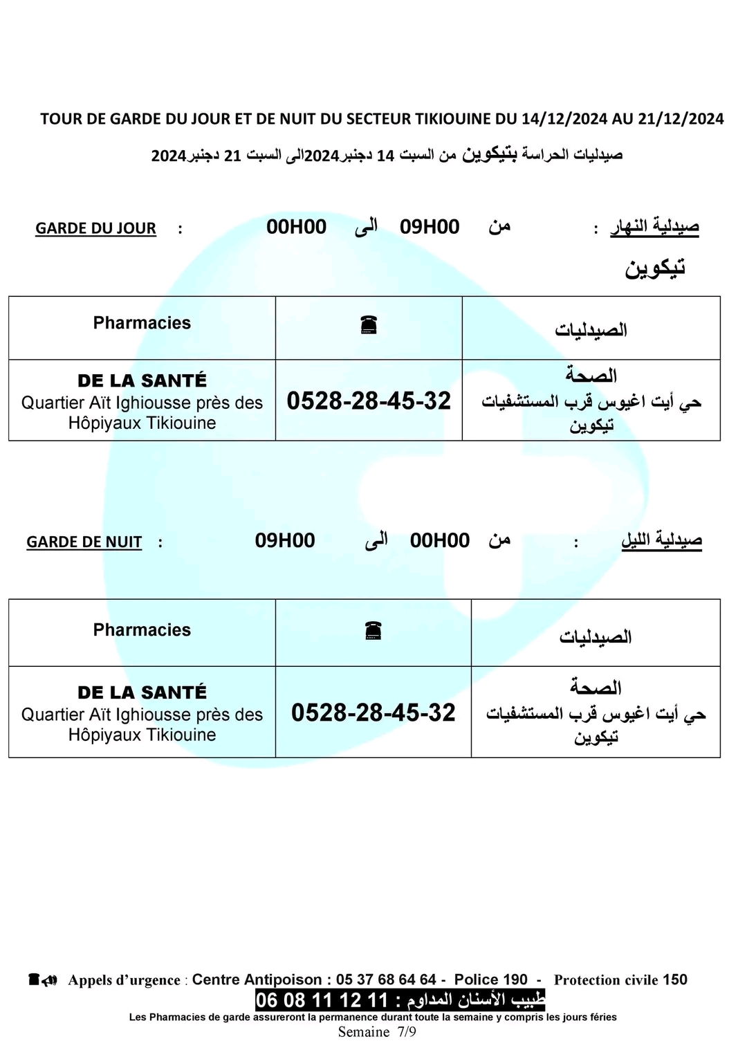 لائحة صيدليات الحراسة لهذا الأسبوع بأكادير وإنزكان وأيت ملول وتيكوين أكاديرإنو 14 دجنبر 2024 - 12:21 Facebook Twitter Whatsapp Whatsapp Messenger Messenger Email صيدليات الحراسة بأكادير وإنزكان وتيكوين وأيت ملول، من السبت 14 دجنبر 2024 على الساعة الواحدة زوالا، إلى السبت 21 دجنبر 2024 على الساعة التاسعة صباحا.