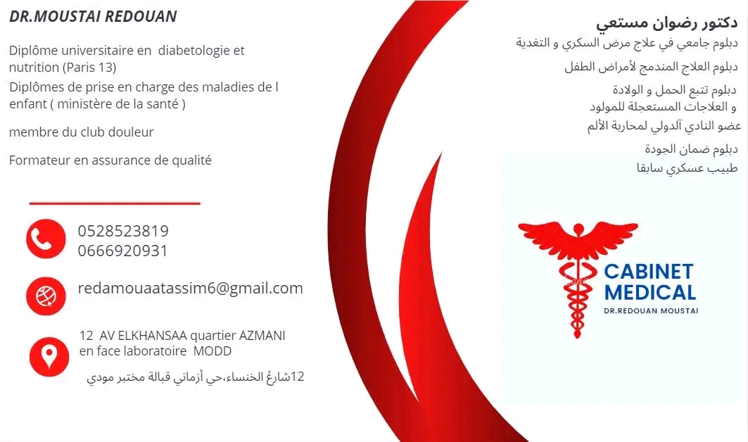 أو قوموا بزيارة العيادة بشارع الخنساء، حي أزماني أمام مختبر التحاليل مودي بأولاد تايمة.