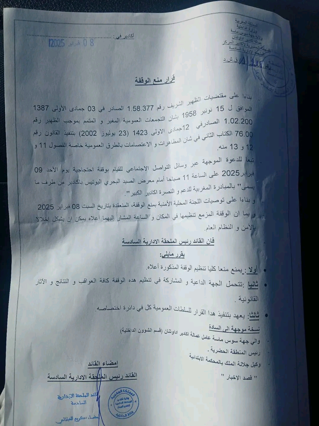 وأكد القرار الذي تتوفر جريدة “أكاديرإنو” على نسخة منه، أن هذا الإجراء يأتي بناءا على توصيات اللجنة المحلية الأمنية بمنع الوقفة، المنعقدة أمس السبت، مؤكدا أن الوقفة المزمع تنظيمها يمكن أن يشكل إخلالا بالأمن والنظام العام.