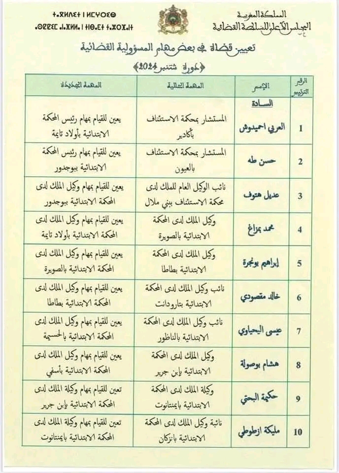 ويتعلق الأمر بتعيين كل من المستشارين بمحكمة الاستئناف بكلميم، لحسن بعيز، وجلال ارجدالي، والقاضي بالمحكمة الابتدائية بطاطا، إسماعيل الزرورة، والقضاة بالمحكمة الابتدائية بتارودانت رضوان معني وشفيق علوان ورضا الصمدي، كقضاة بالمحكمة الابتدائية بأولاد تايمة.
