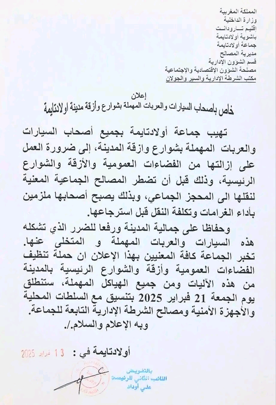 أعلنت جماعة أولاد تايمة أن حملة تنظيف أزقة وشوارع المدينة من السيارات المتخلى عنها والمهملة، ستنطلق يوم الجمعة 21 فبراير الجاري، وذلك بتنسيق مع السلطات المحلية والأجهزة الأمنية ومصالح الشرطة الإدارية التابعة للجماعة.