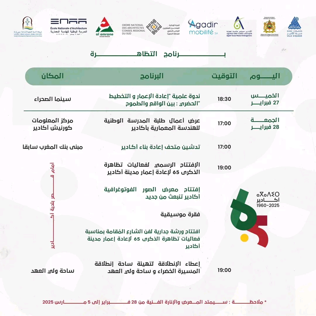 ويتضمن برنامج هذه التظاهرة تدشين متحف إعادة بناء أكادير، المقام ببناية بنك المغرب سابقا، وإقامة معرض فوتوغرافي بساحة انطلاقة المسيرة الخضراء أمام القصر البلدي لأكادير، يوثق ماضي المدينة وحاضرها، إلى جانب تكريم الدول والمهندسين الذين ساهموا في إعادة إعمارها.