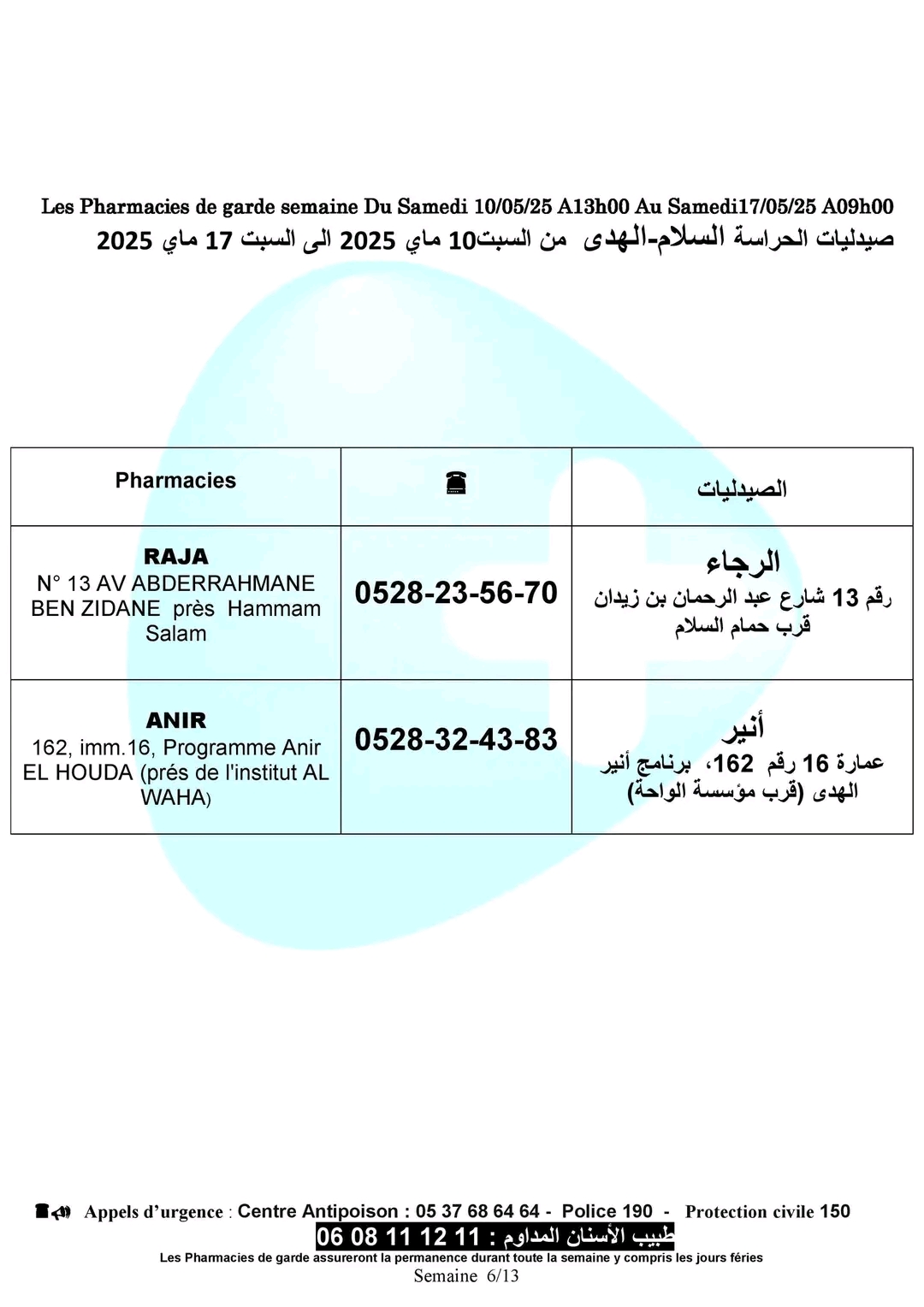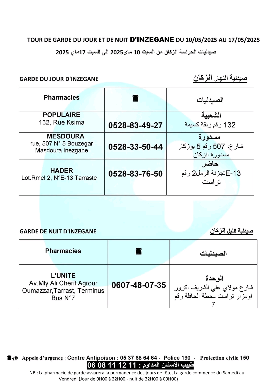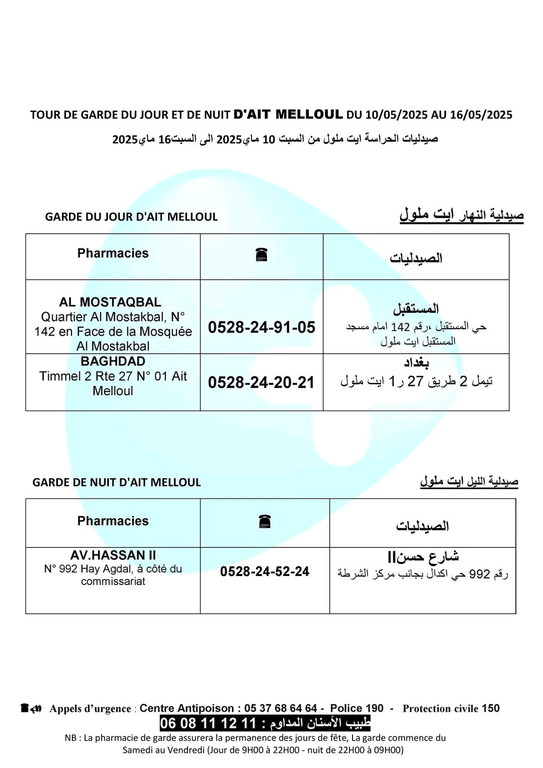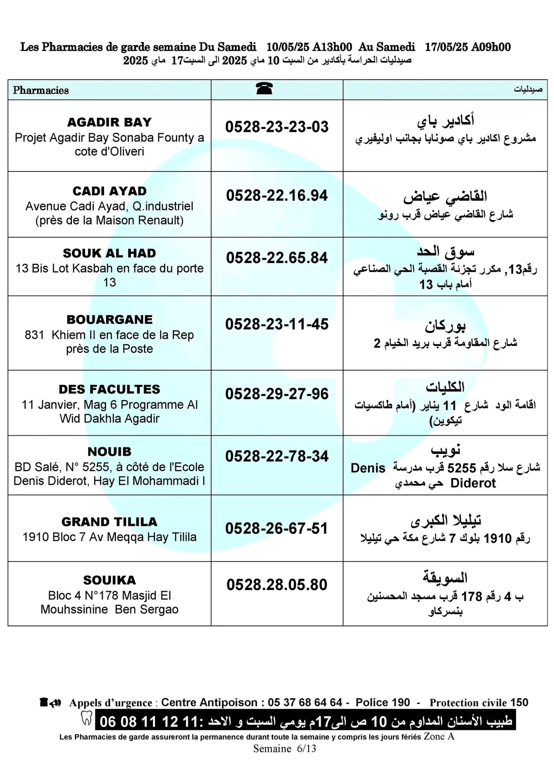 لائحة صيدليات الحراسة لهذا الأسبوع بأكادير وإنزكان وتيكوين وأيت ملول أكاديرإنو 10 ماي 2025 - 14:06 Facebook Twitter Whatsapp Whatsapp Messenger Messenger Email صيدليات الحراسة بأكادير وإنزكان وتيكوين وأيت ملول، من السبت 10 ماي 2025، على الساعة الواحدة زوالا، إلى السبت 17 ماي 2025 على الساعة التاسعة صباحا.