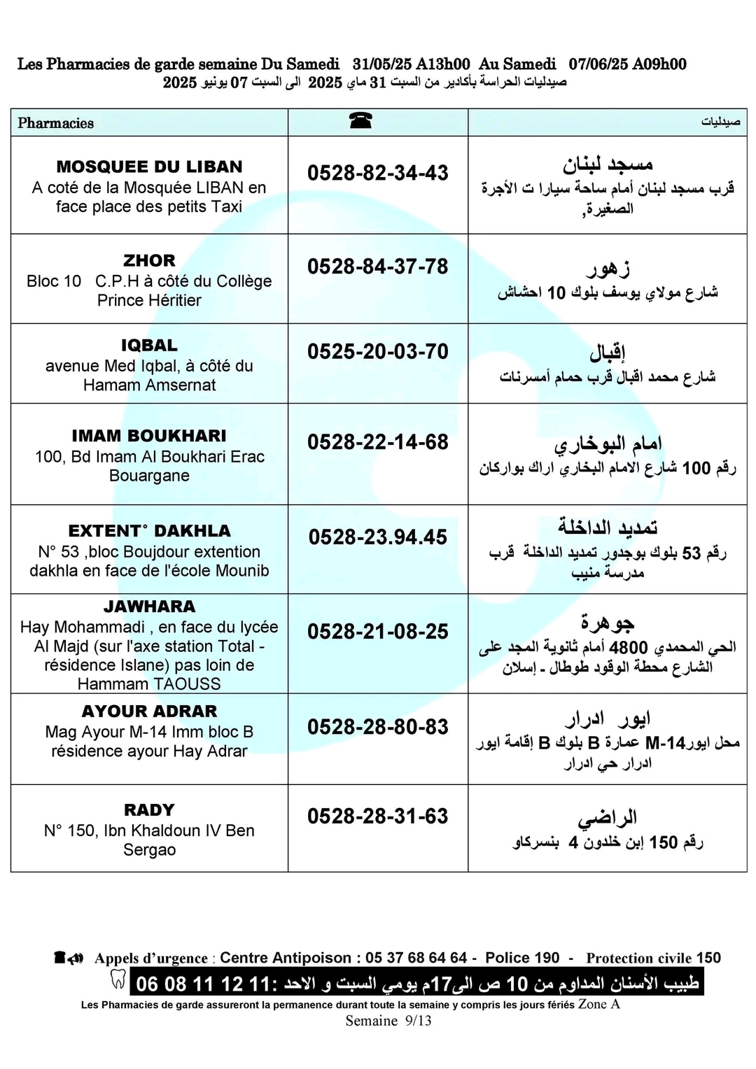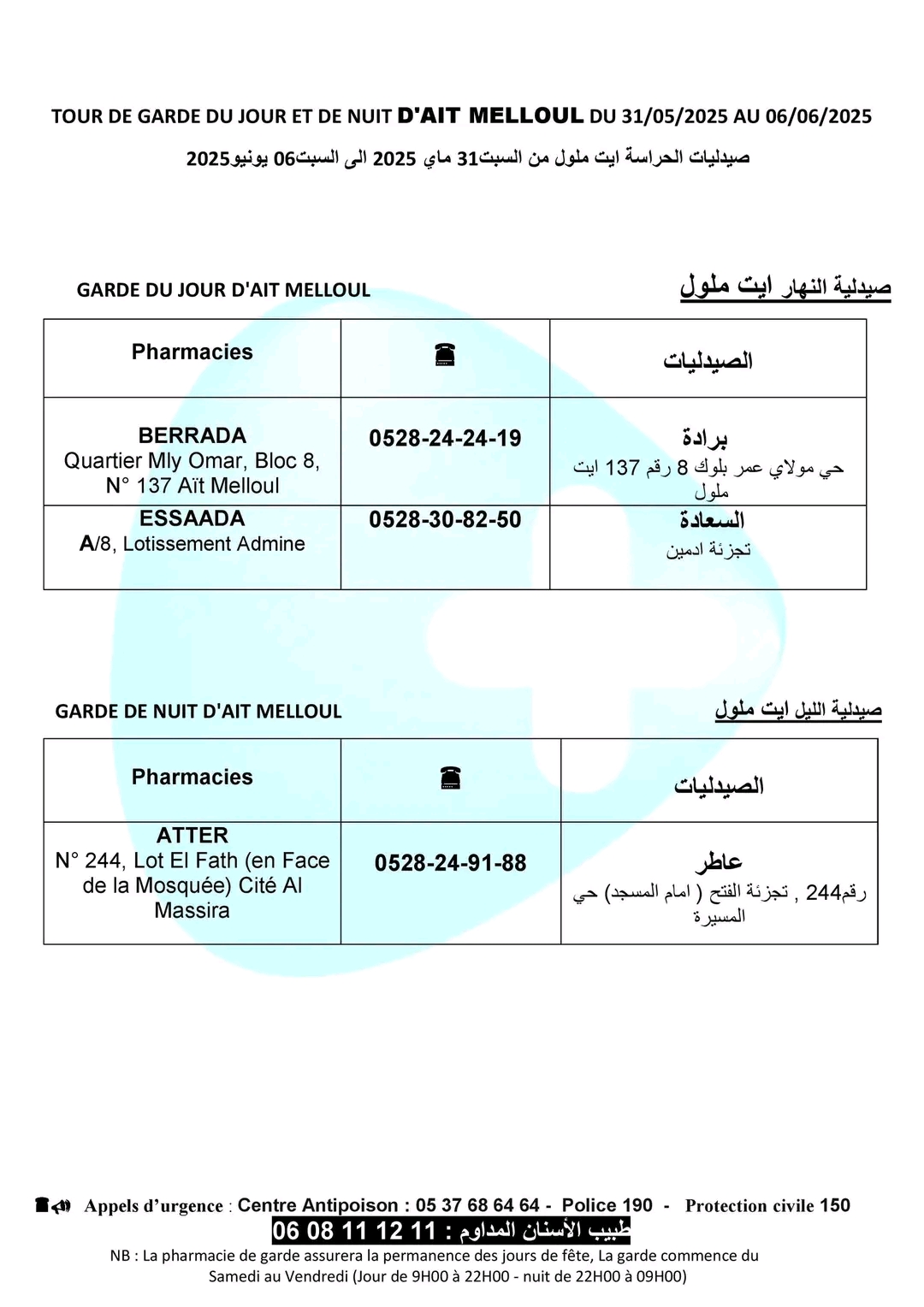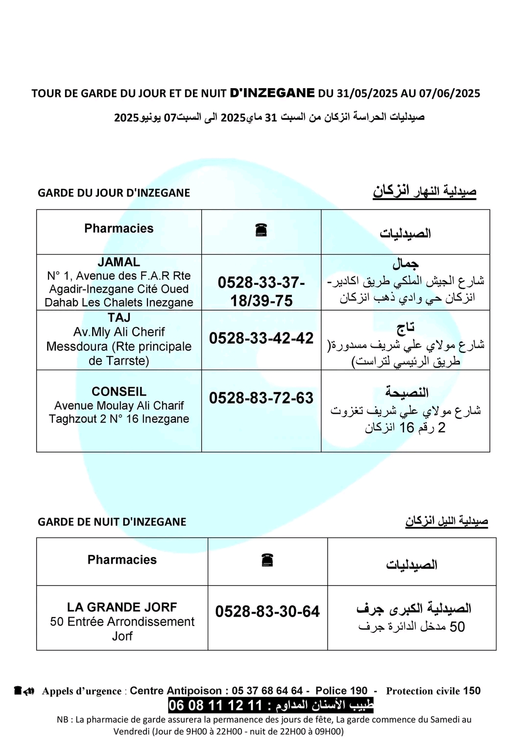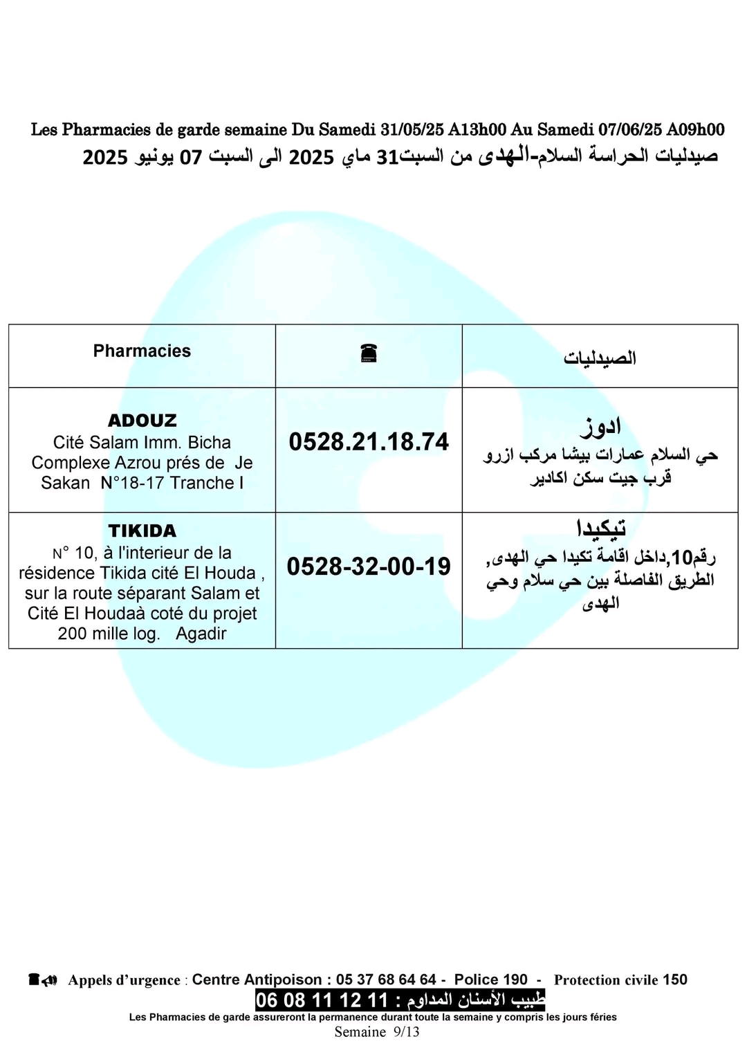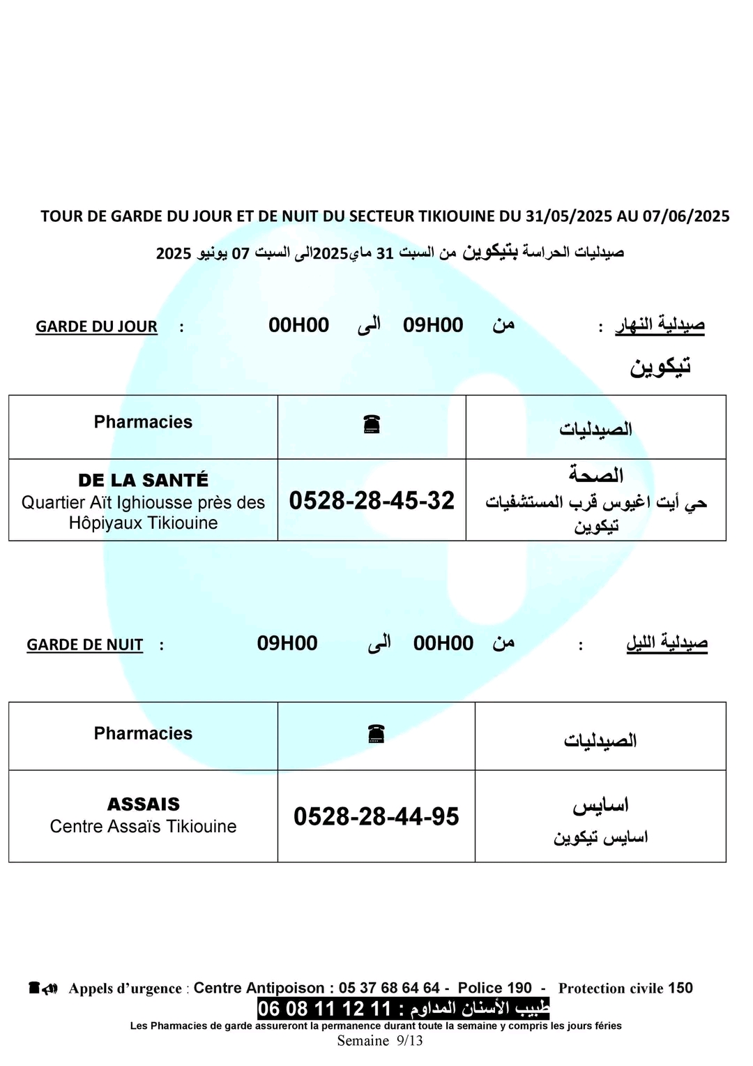 صيدليات الحراسة بأكادير وإنزكان وتيكوين وأيت ملول، من السبت 31 ماي 2025، على الساعة الواحدة زوالا، إلى السبت 07 يونيو 2025 على الساعة التاسعة صباحا.