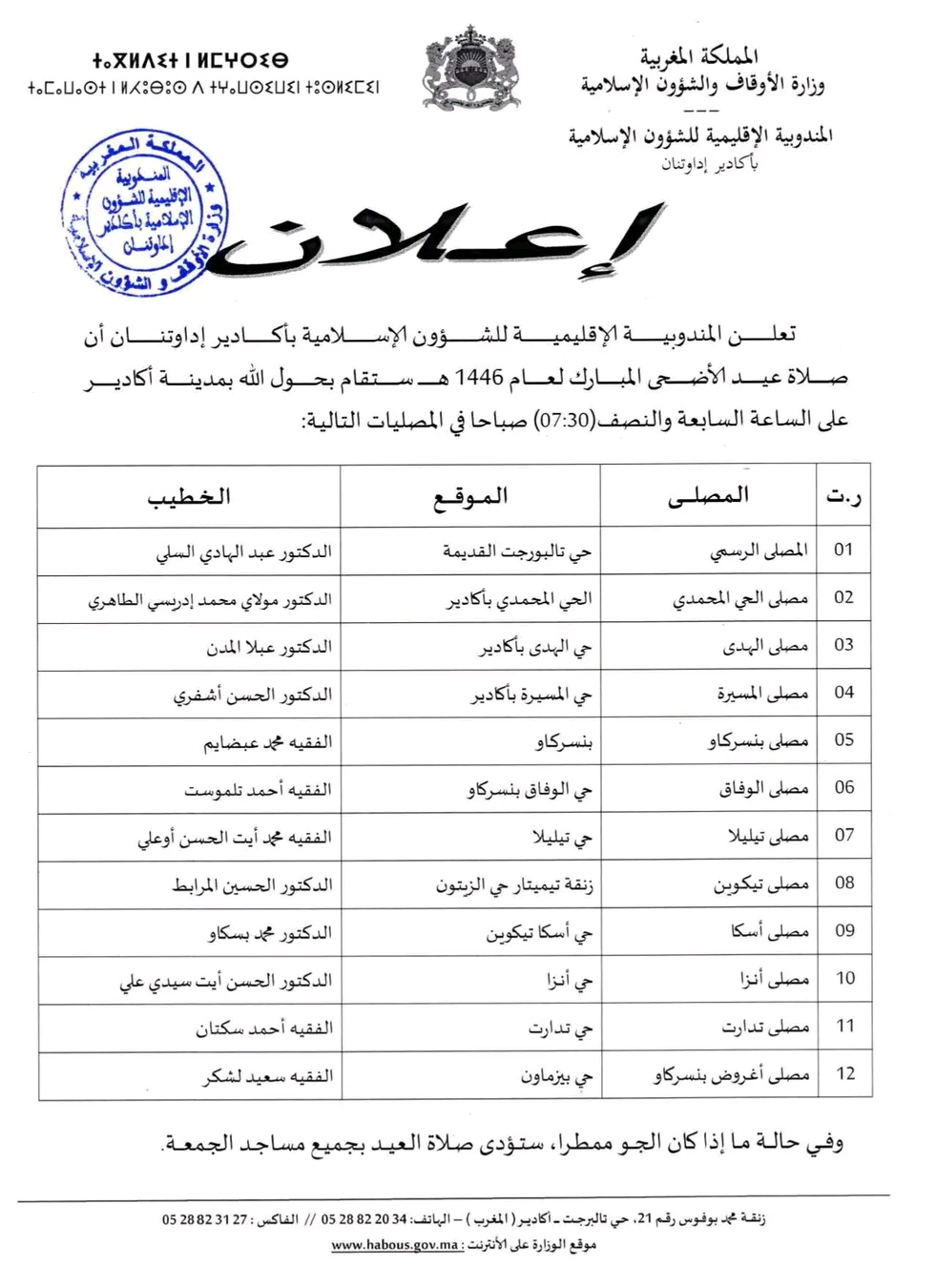 وهذه لائحة المصليات التي ستقام فيها صلاة العيد، ومواقعها، واسم الخطيب: